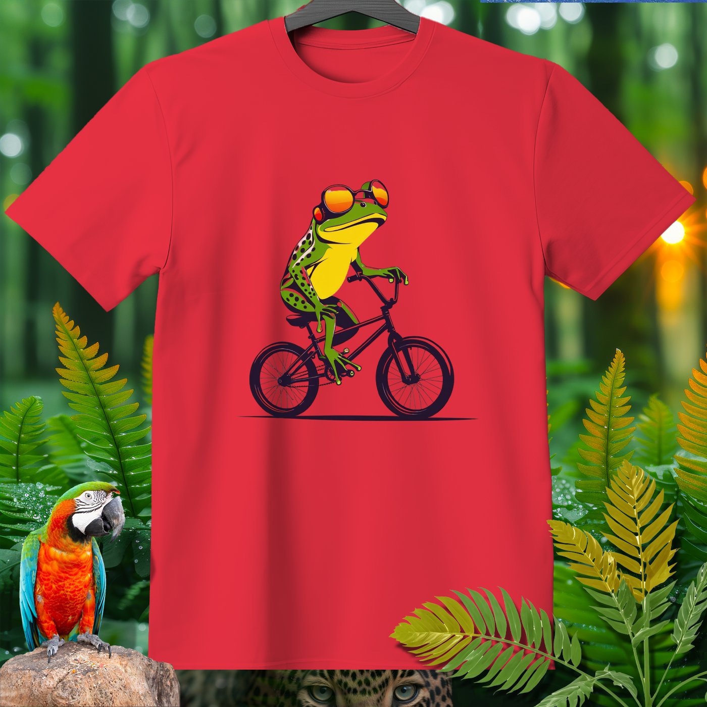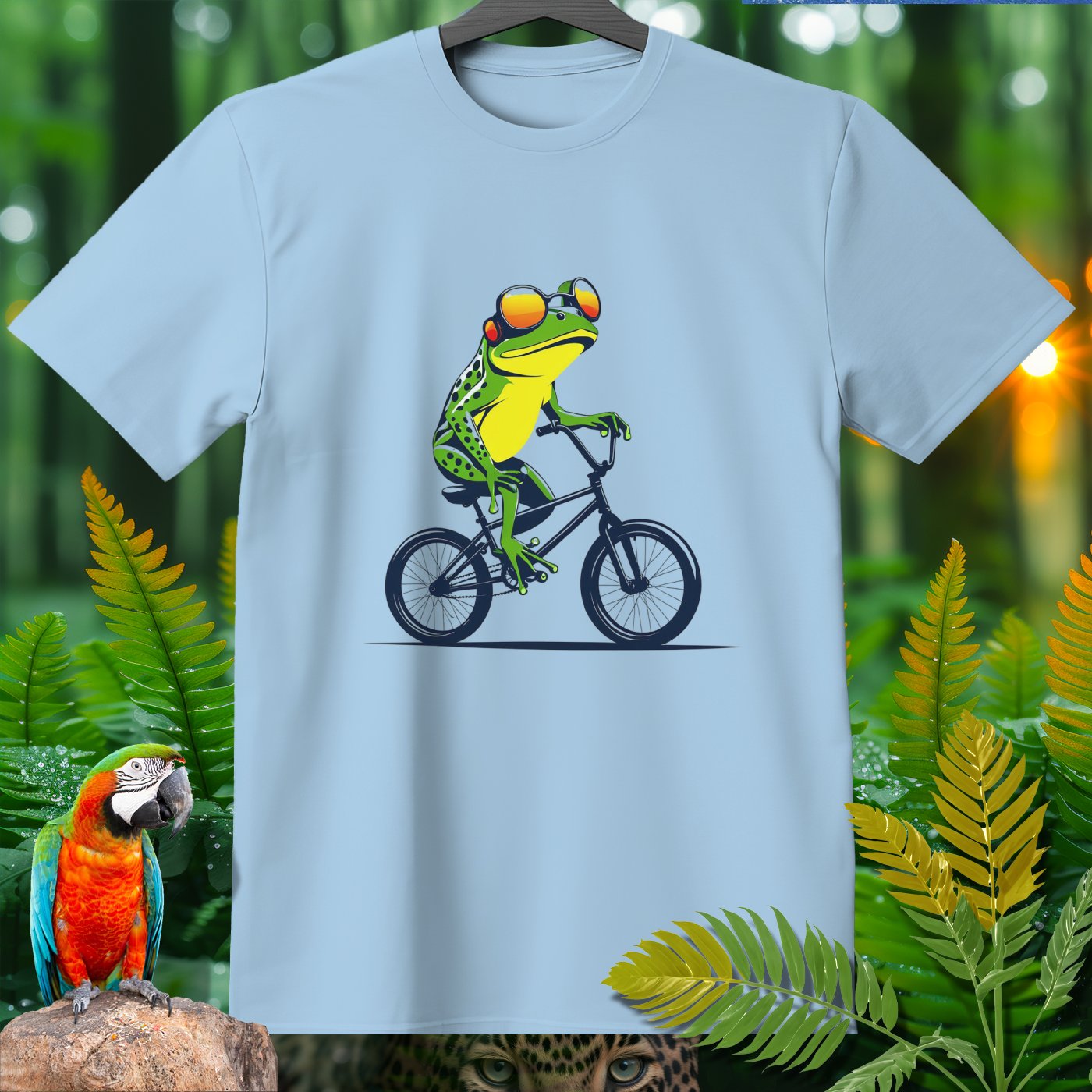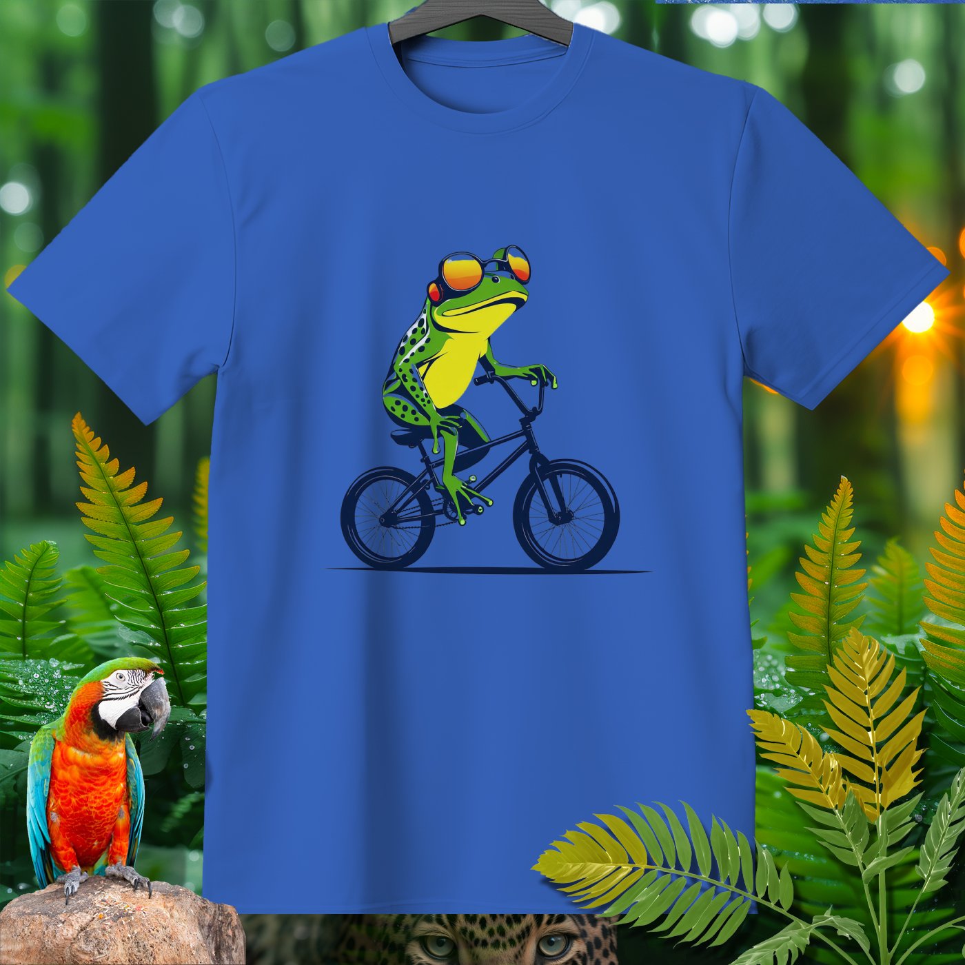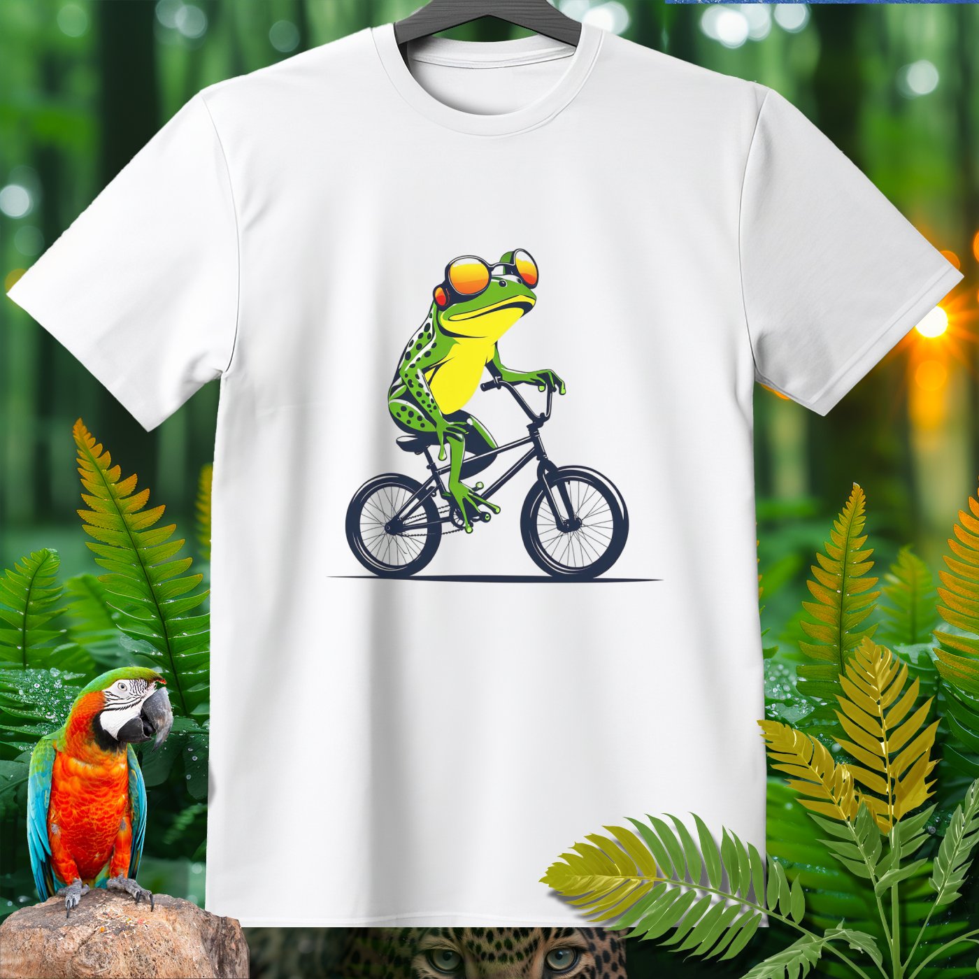 This T-Shirt from our Amazoomania Collection features a frog doing the craziest thing when we aren't watching! Meet our sporty frog who loves to ride his BMX in style. With a cool set of shades and a confident pose, this vibrant design is sure to make everyone smile. Ideal for sports enthusiasts and animal lovers alike, this tee is perfect for adding a fun twist to your casual wardrobe.