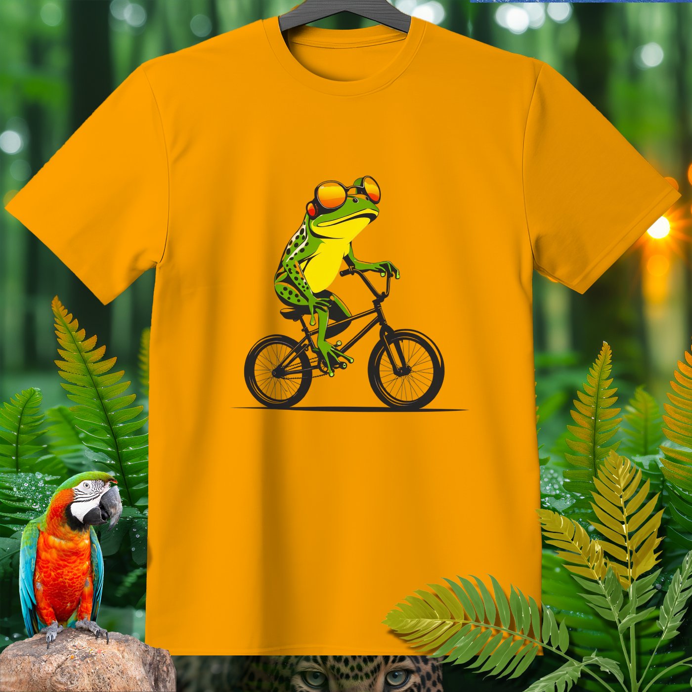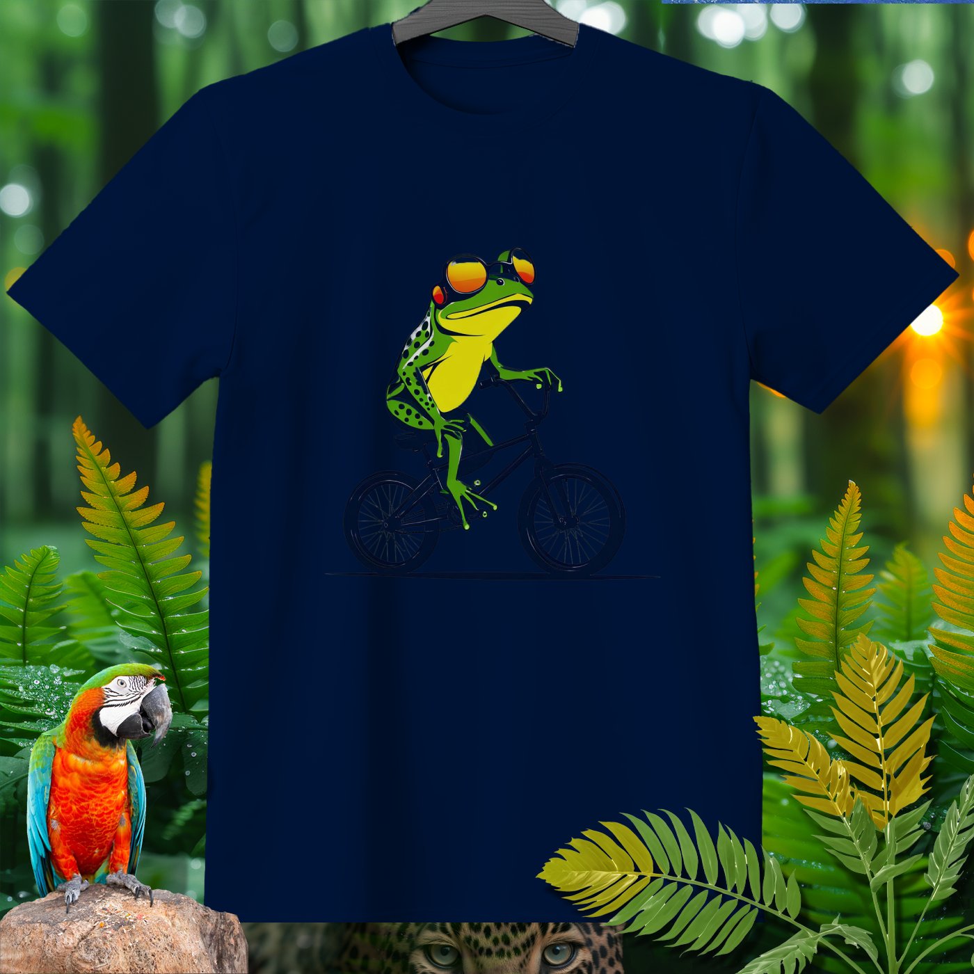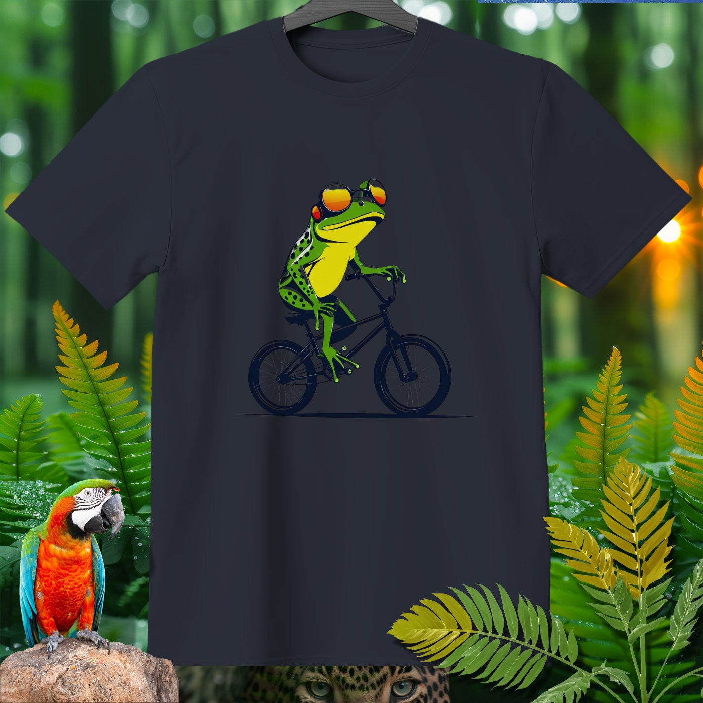 This T-Shirt from our Amazoomania Collection features a frog doing the craziest thing when we aren't watching! Meet our sporty frog who loves to ride his BMX in style. With a cool set of shades and a confident pose, this vibrant design is sure to make everyone smile. Ideal for sports enthusiasts and animal lovers alike, this tee is perfect for adding a fun twist to your casual wardrobe.