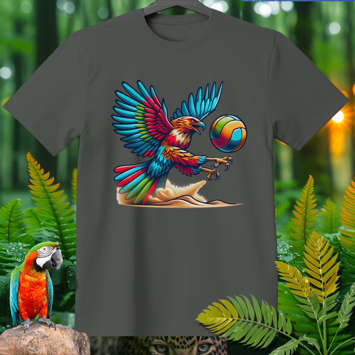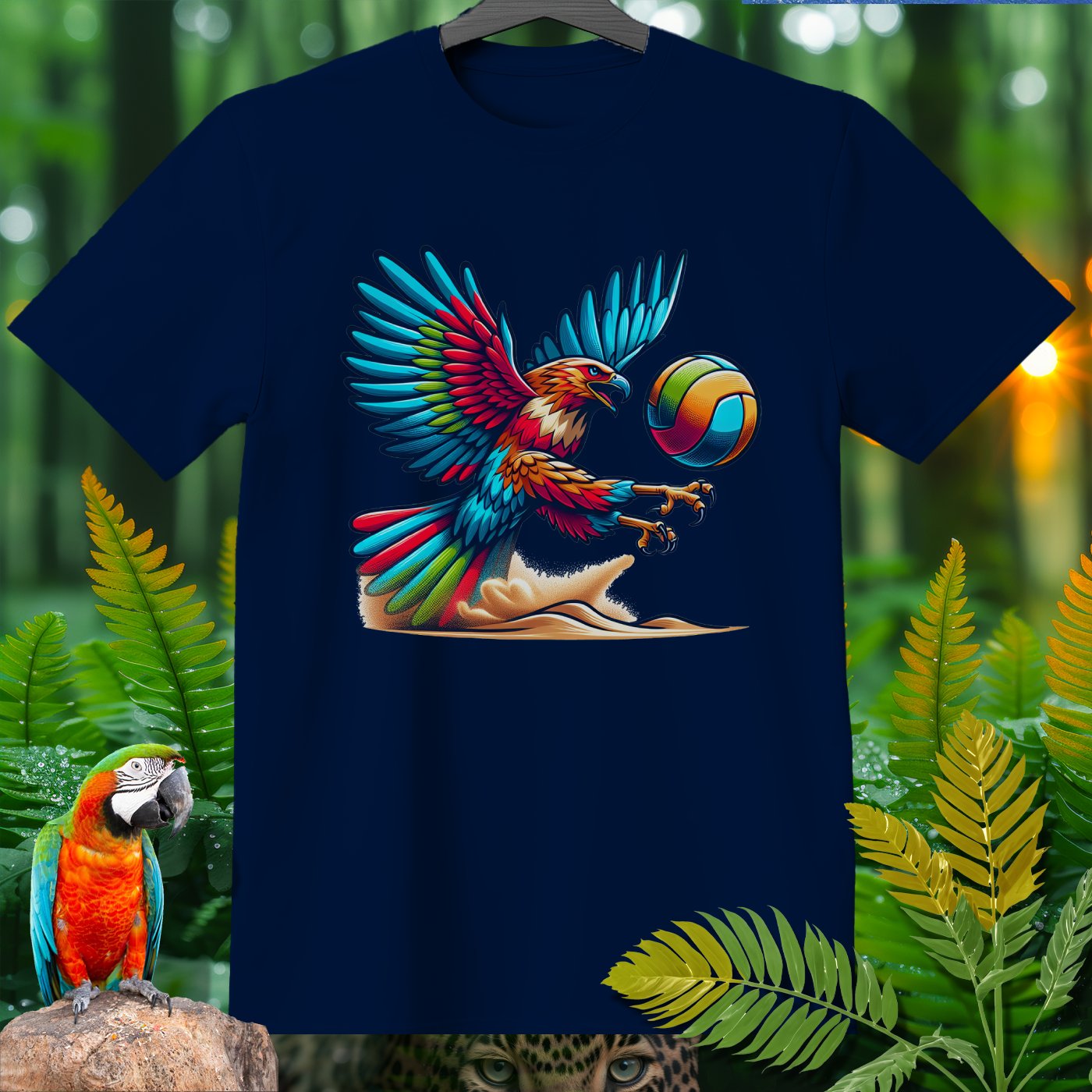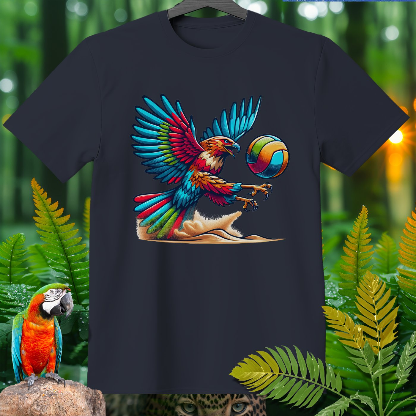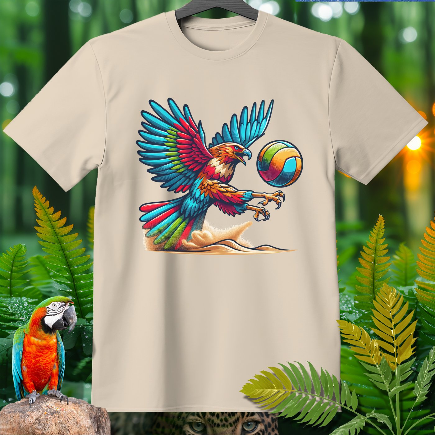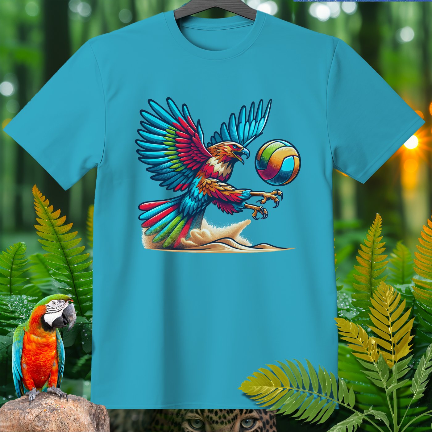 Introducing the Amazoomania collection, where whimsical woodland creatures take on thrilling sports escapades! This vibrant clothing piece features a majestic eagle engaged in a spirited game of volleyball. The intricately detailed design captures the eagle's fierce determination and the exhilarating energy of the game. Perfect for those who love to infuse their wardrobe with unique, fun, and adventurous elements. Whether you're a sports enthusiast or an animal lover, this piece invites you to embrace the A-Z of excitement and embark on your own adventures.