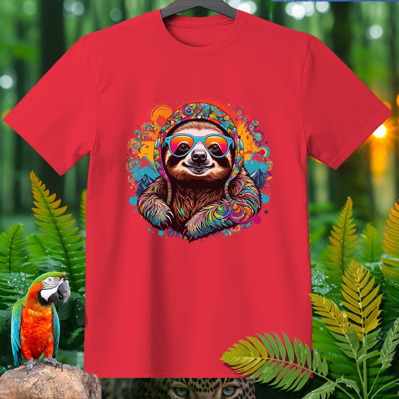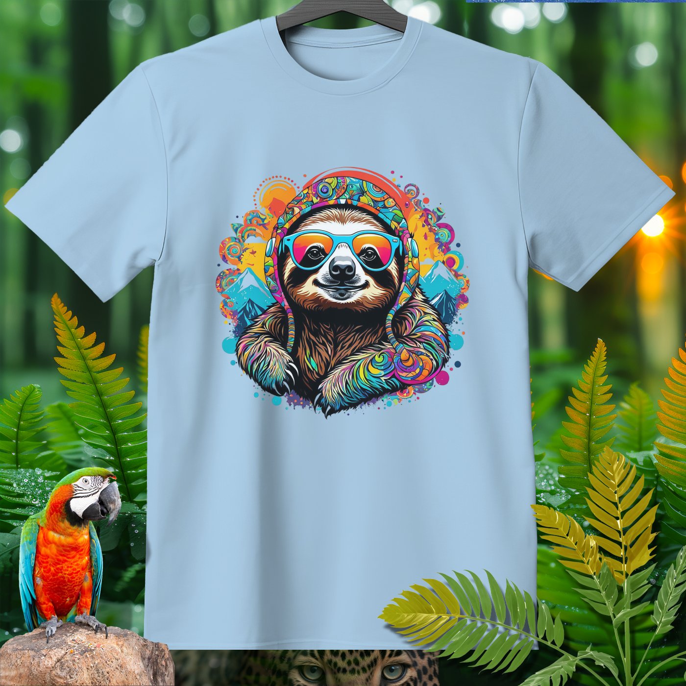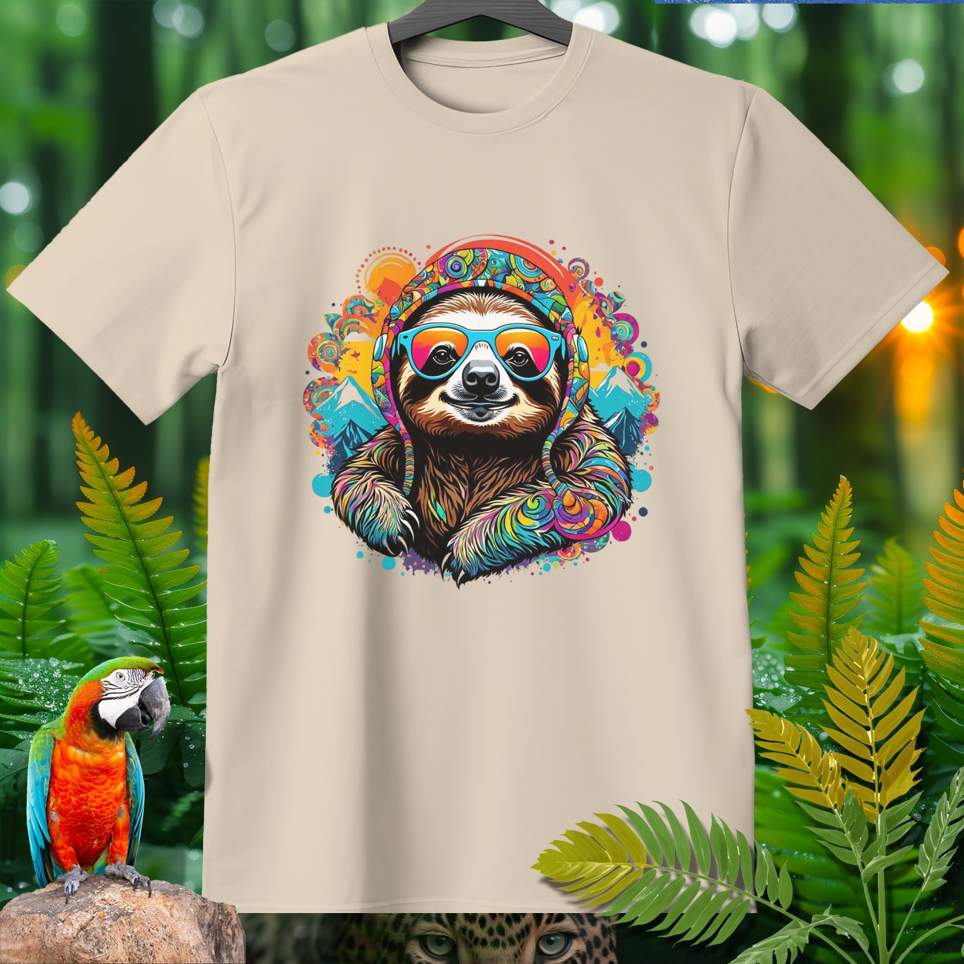 Get ready to add a splash of fun and color to your wardrobe with our Amazoomania Collection! Witness the ultimate sloth - sporting vibrant headphones and groovy sunglasses, surrounded by a kaleidoscope of colors and whimsical mountains. This T-shirt is a perfect blend of chill vibes and sporty style, making it an excellent choice for any laid-back adventure. Whether you're lounging at home or hanging out with friends, this funky design will make sure you're the life of the party. Embrace the craziness of the animal kingdom when we aren't watching, and let this cool, colorful sloth bring a smile to your face!