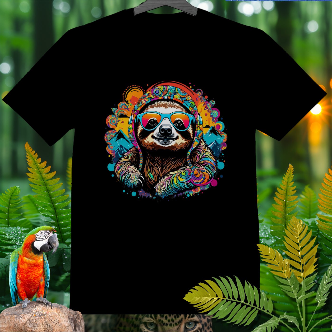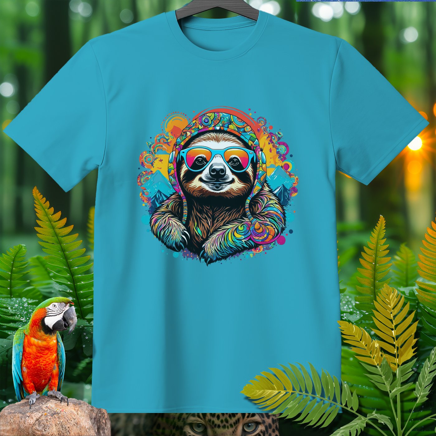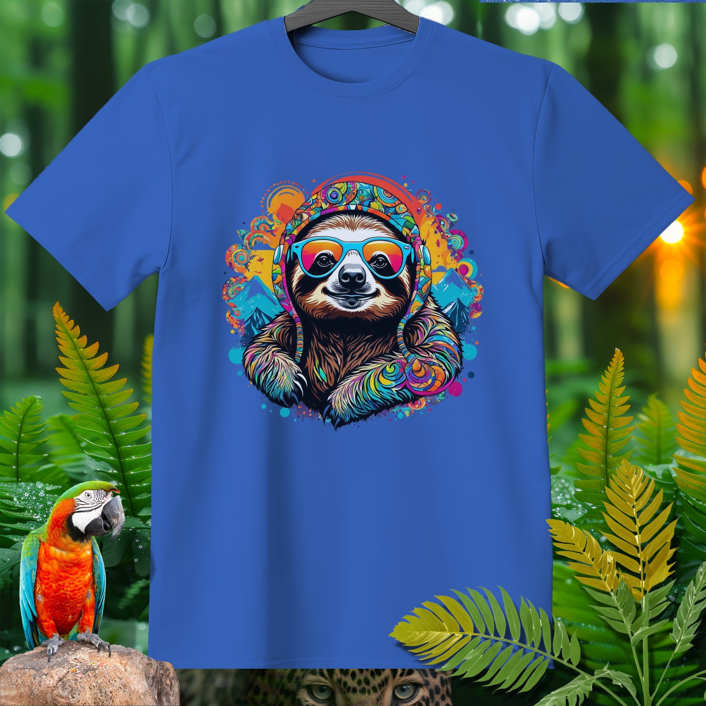 Get ready to add a splash of fun and color to your wardrobe with our Amazoomania Collection! Witness the ultimate sloth - sporting vibrant headphones and groovy sunglasses, surrounded by a kaleidoscope of colors and whimsical mountains. This T-shirt is a perfect blend of chill vibes and sporty style, making it an excellent choice for any laid-back adventure. Whether you're lounging at home or hanging out with friends, this funky design will make sure you're the life of the party. Embrace the craziness of the animal kingdom when we aren't watching, and let this cool, colorful sloth bring a smile to your face!