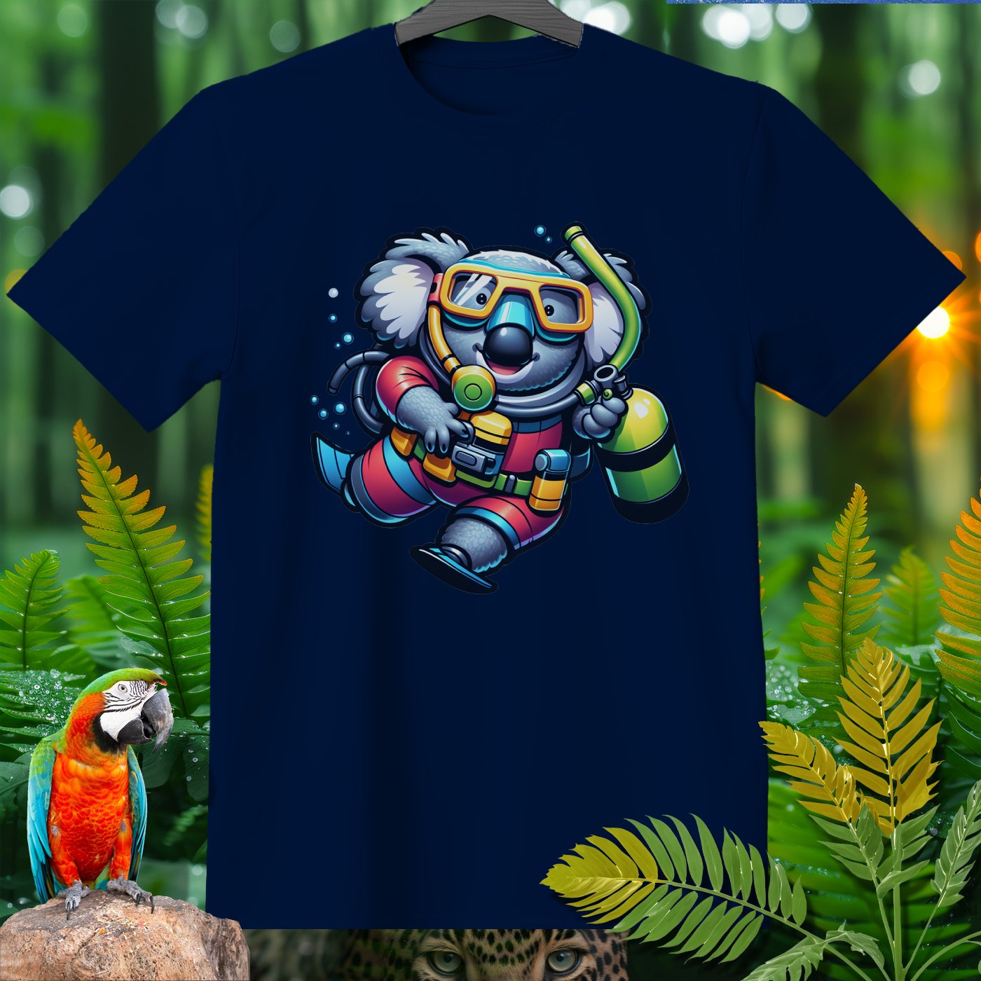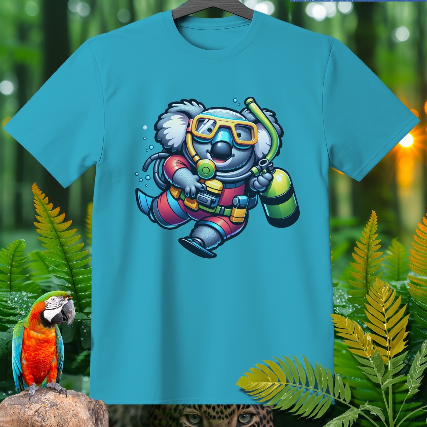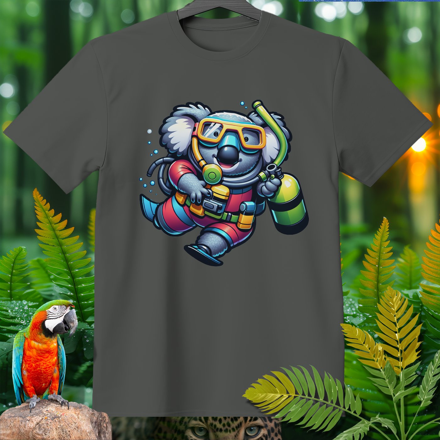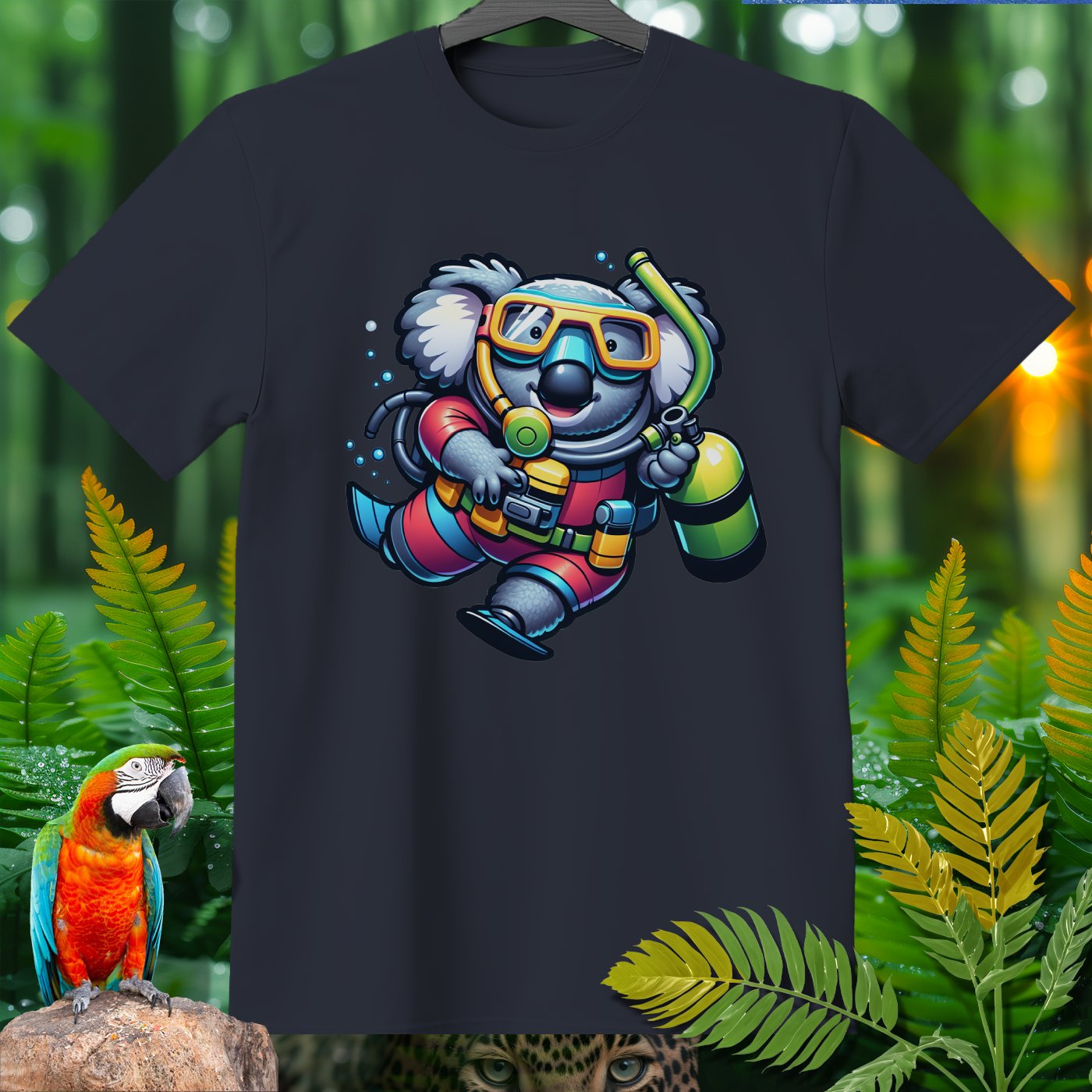 Dive into the whimsical world of the Amazoomania collection with our unique, fun, and adventurous designs! Introducing a delightful koala, transformed into a daring deep-sea diver, bringing a splash of excitement to your wardrobe. This playful design captures the adorable koala in full scuba gear, exploring the depths with a cheerful charm. Perfect for those who love to embrace the A-Z of excitement, our clothing item is a must-have for anyone looking to add a touch of humor and adventure to their style. Join the Amazoomania adventure today!