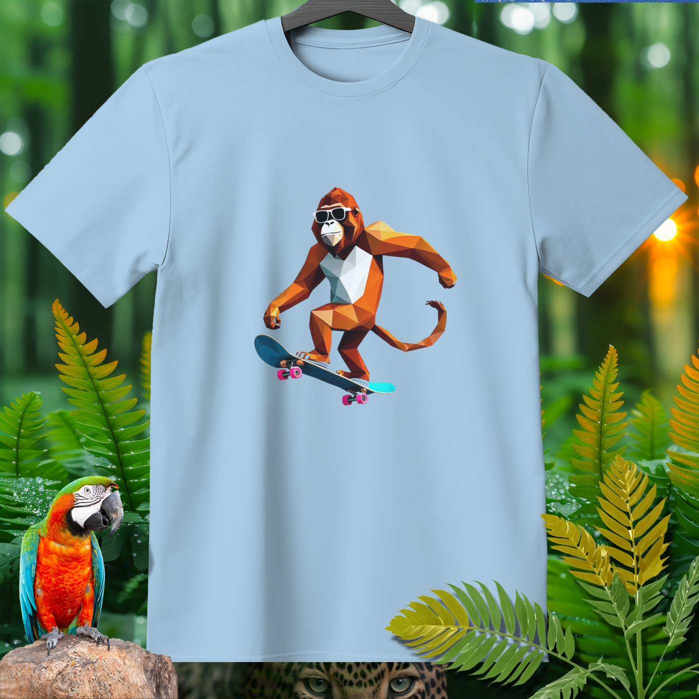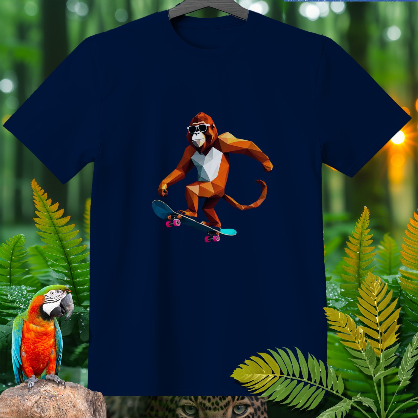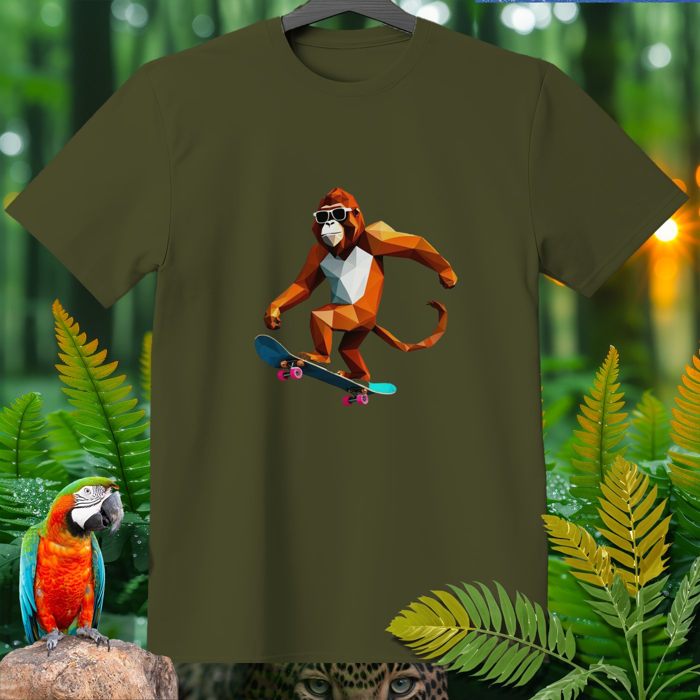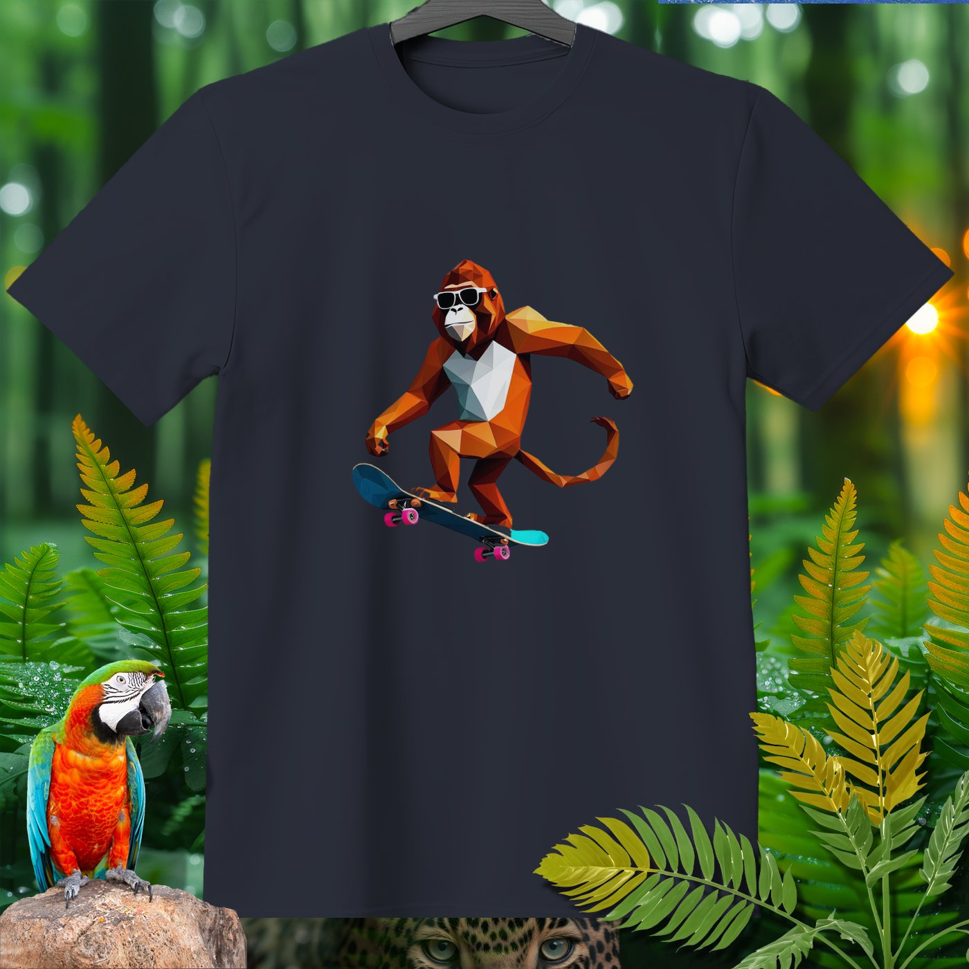 Get ready to roll with our Amazoomania Collection! Check out this cool geometric monkey shredding on a skateboard. Perfect for adding a splash of fun and sport to your wardrobe, this T-shirt shows what happens when animals embrace their wilder side. Whether you’re a skateboarding enthusiast or just love quirky designs, this sporty tee is a must-have. Dive into the whimsical world where sporty animals do the craziest things when we aren't watching!