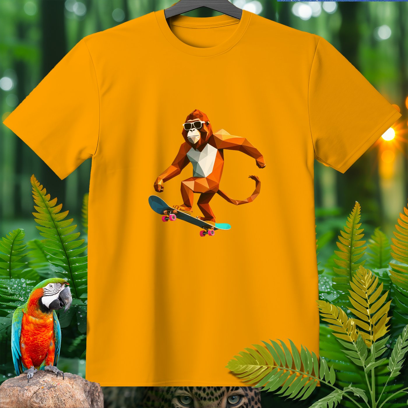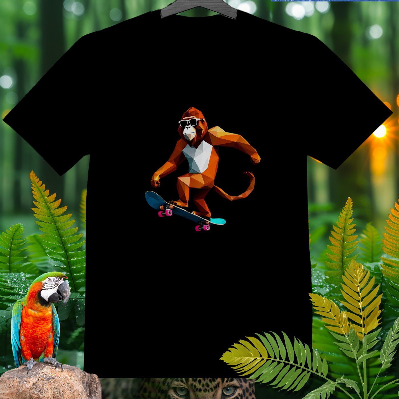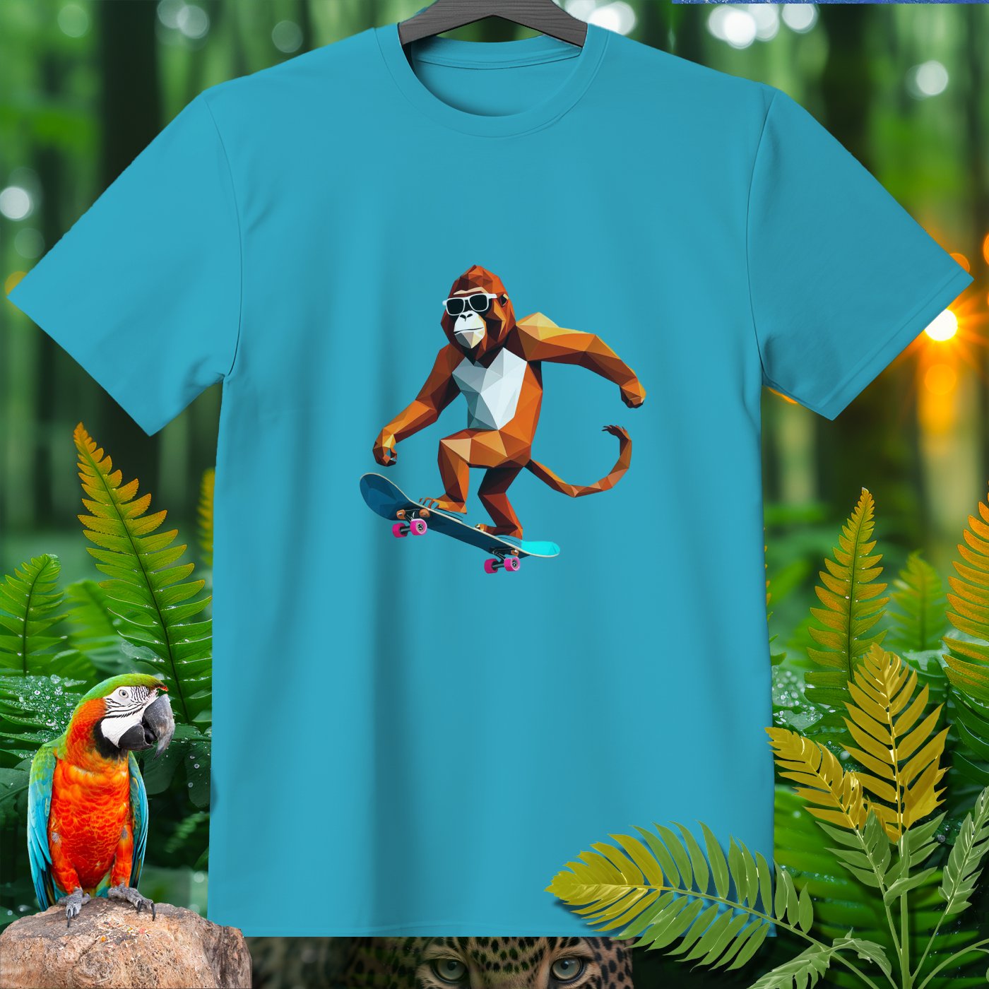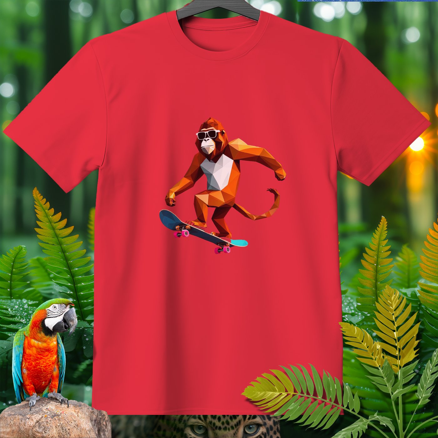 Get ready to roll with our Amazoomania Collection! Check out this cool geometric monkey shredding on a skateboard. Perfect for adding a splash of fun and sport to your wardrobe, this T-shirt shows what happens when animals embrace their wilder side. Whether you’re a skateboarding enthusiast or just love quirky designs, this sporty tee is a must-have. Dive into the whimsical world where sporty animals do the craziest things when we aren't watching!