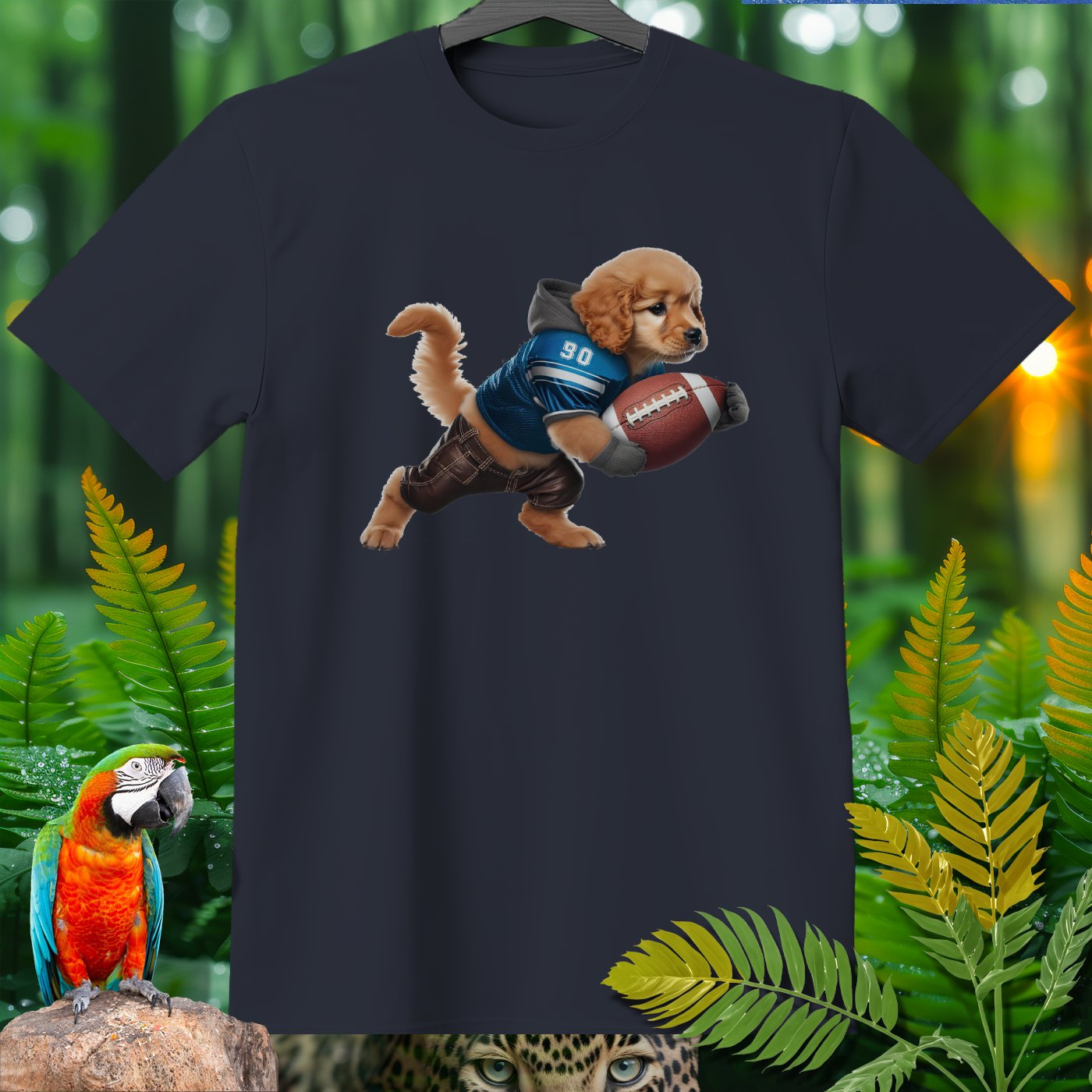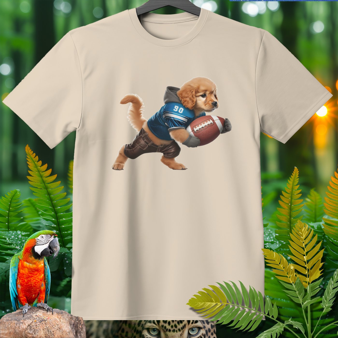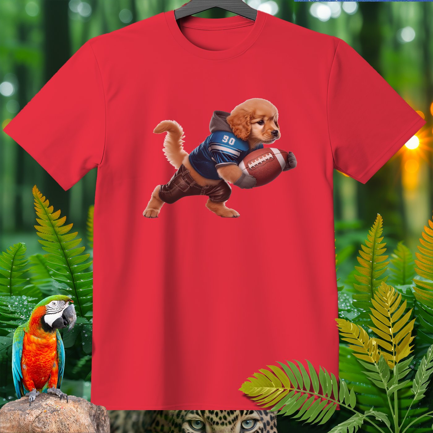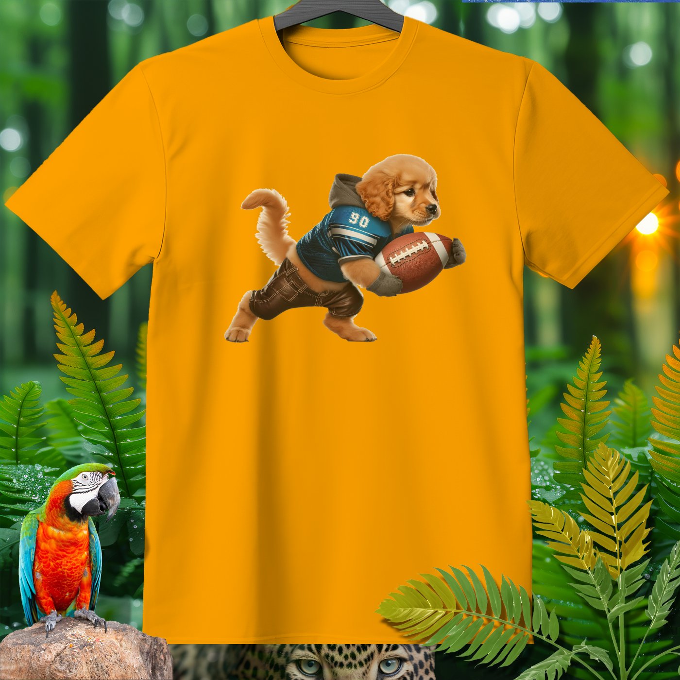Add some playful flair to your wardrobe with our adorable Golden Retriever Puppy Football T-Shirt! Featuring a cute puppy dressed as a football player, this shirt is perfect for animal lovers, sports fans, and anyone who appreciates whimsical designs. Made from high-quality, comfortable fabric, this T-shirt is perfect for casual wear, lounging around, or running errands. The vivid image and detailed design will bring a smile to your face and make you stand out in any crowd. Great for gifting on birthdays, holidays, or just because!