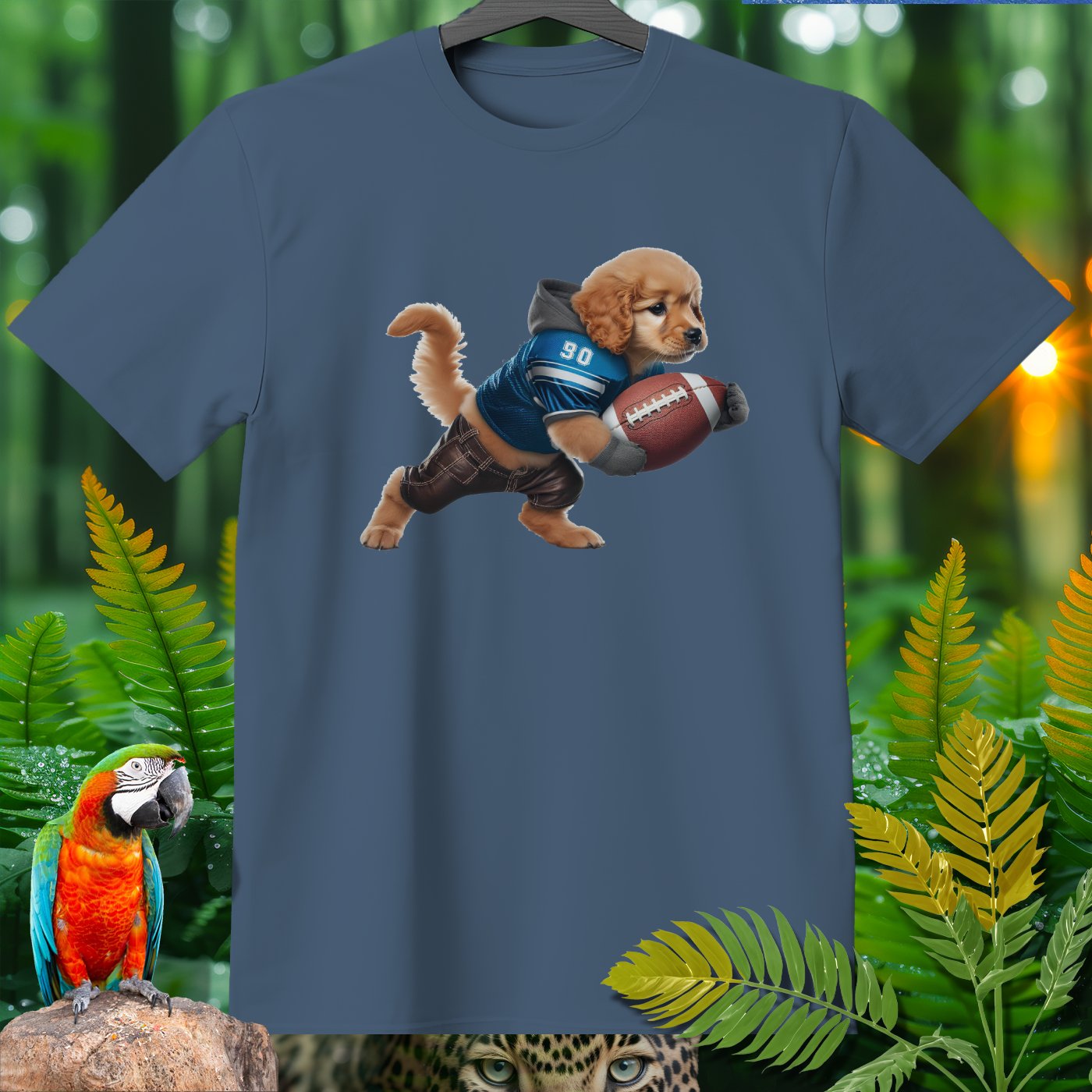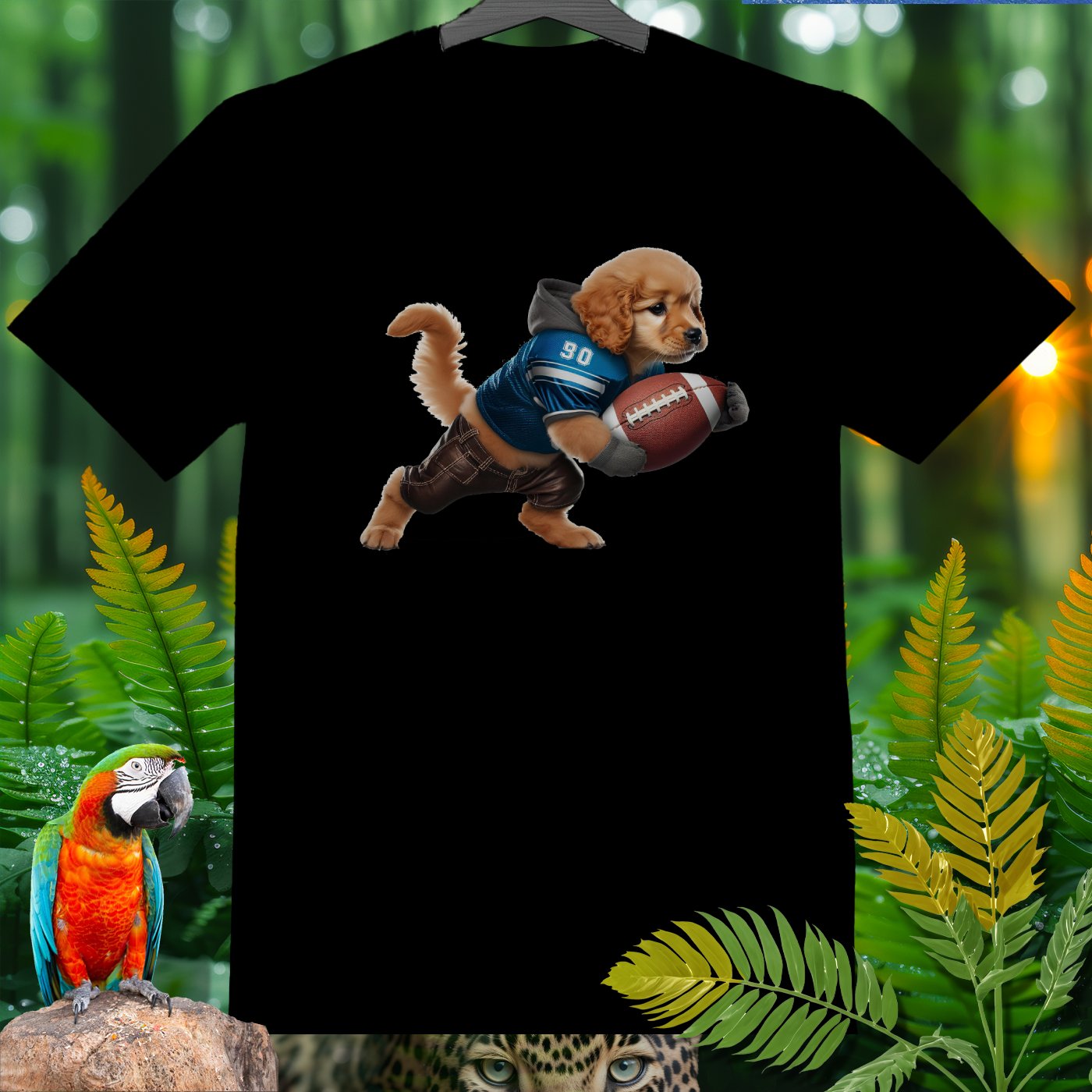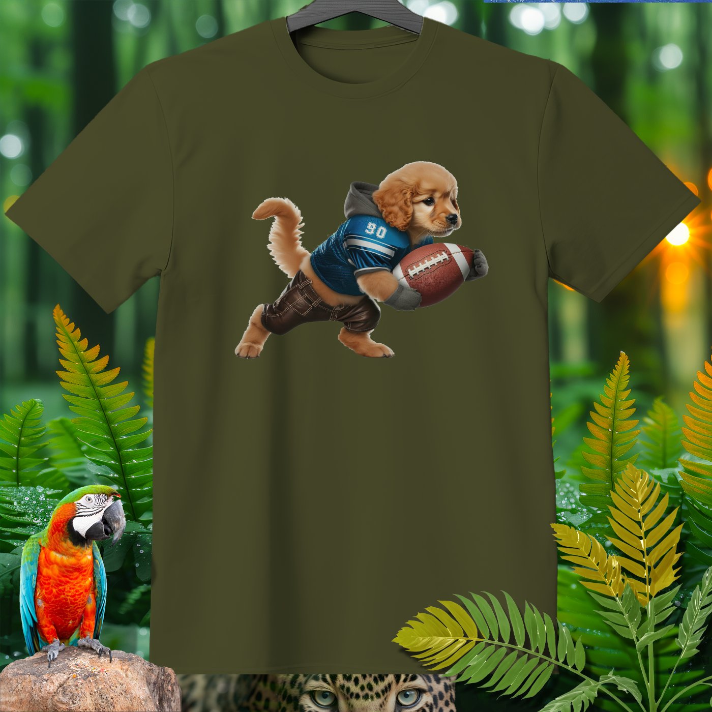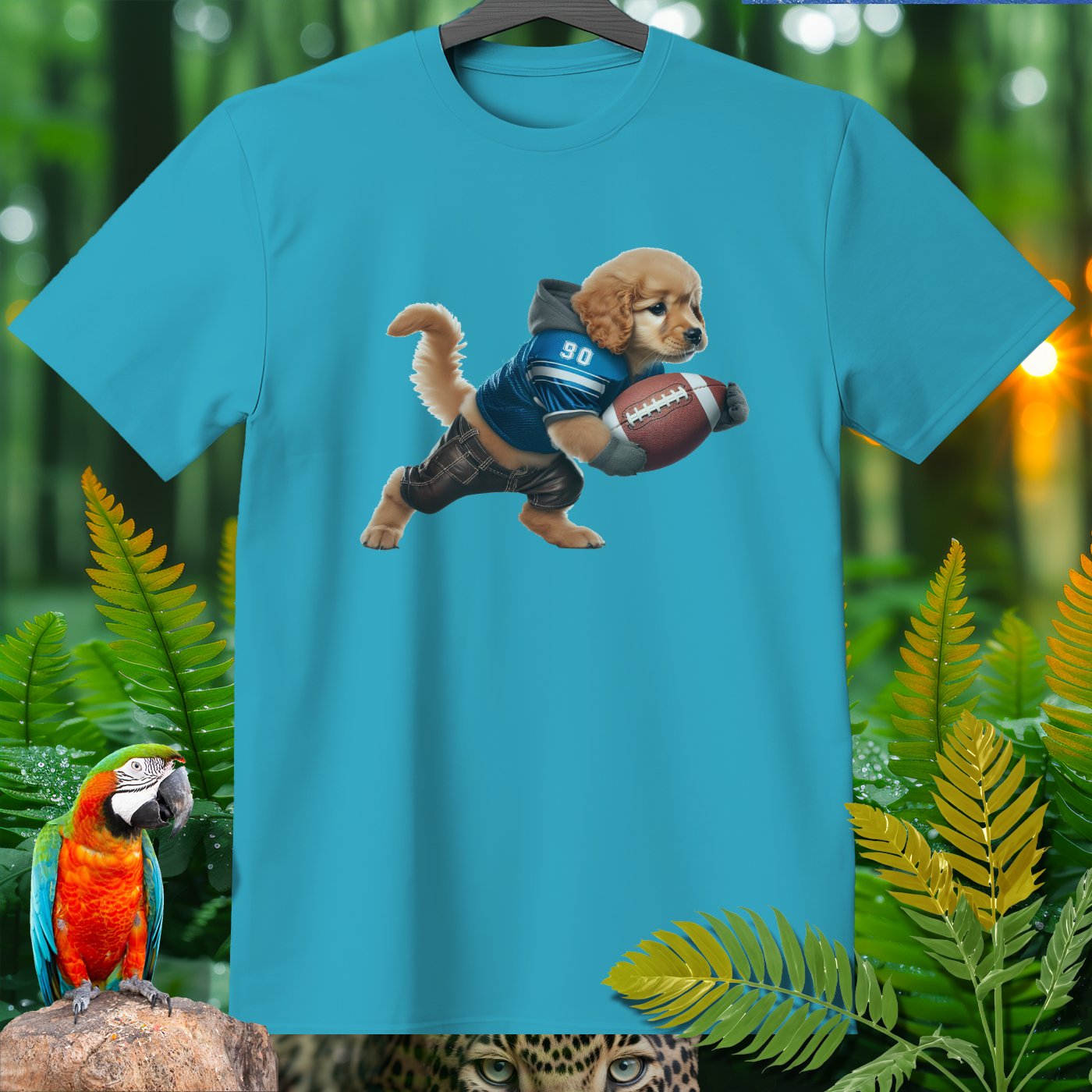 Add some playful flair to your wardrobe with our adorable Golden Retriever Puppy Football T-Shirt! Featuring a cute puppy dressed as a football player, this shirt is perfect for animal lovers, sports fans, and anyone who appreciates whimsical designs. Made from high-quality, comfortable fabric, this T-shirt is perfect for casual wear, lounging around, or running errands. The vivid image and detailed design will bring a smile to your face and make you stand out in any crowd. Great for gifting on birthdays, holidays, or just because!