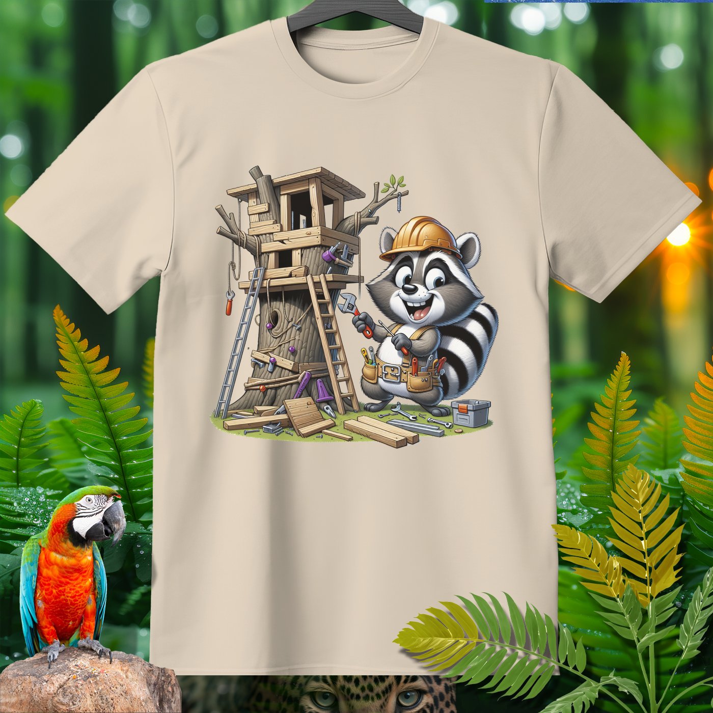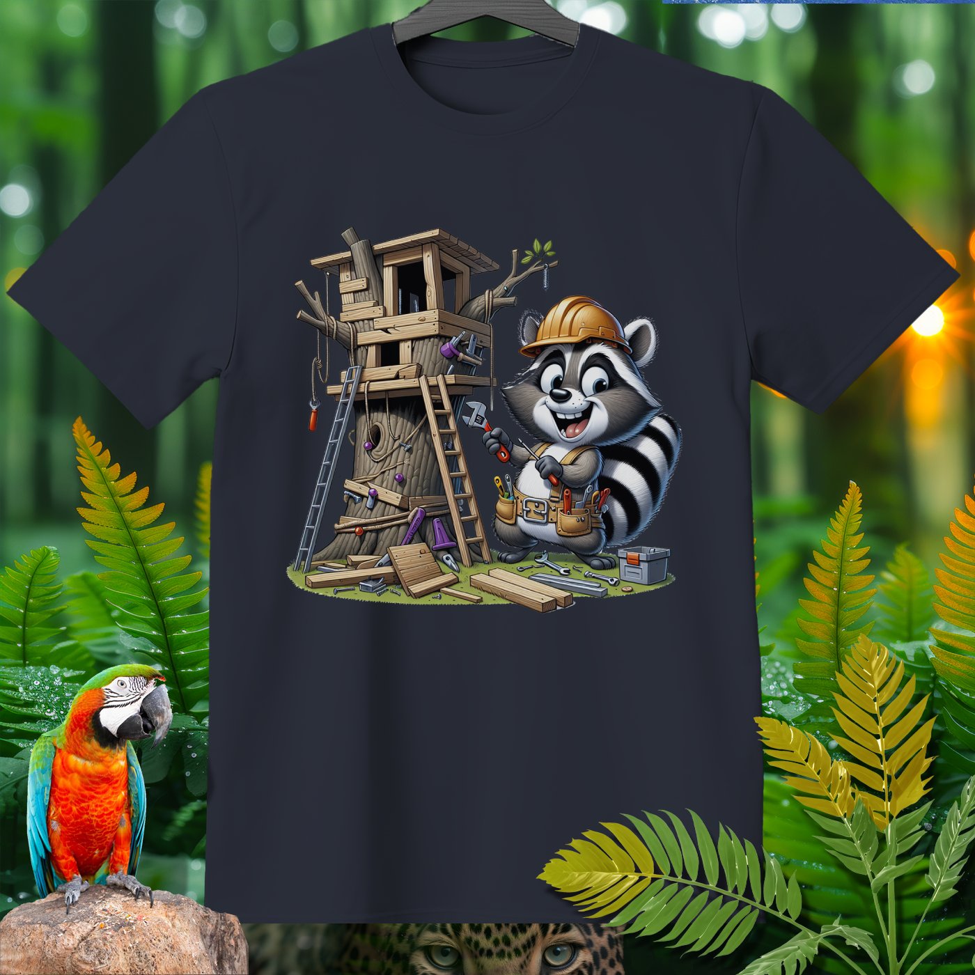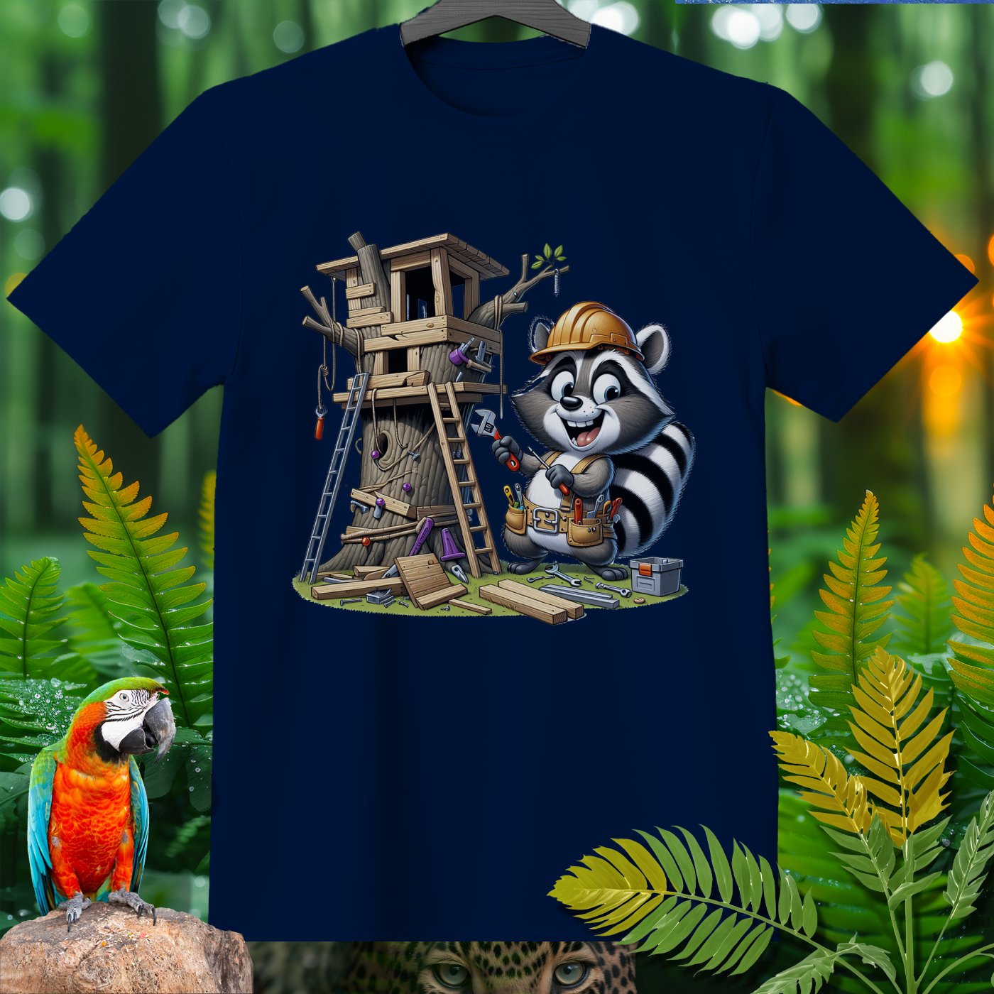 Welcome to the Amazoomania collection, where animals embark on humorous and adventurous sports and activities! This unique design features a cheerful raccoon sporting a tool belt and helmet, busy constructing an elaborate treehouse. The playful and hardworking raccoon brings fun and adventure to your wardrobe, making it a delightful addition for lovers of extraordinary and entertaining designs. Embrace the A-Z of excitement with this one-of-a-kind piece from our collection!