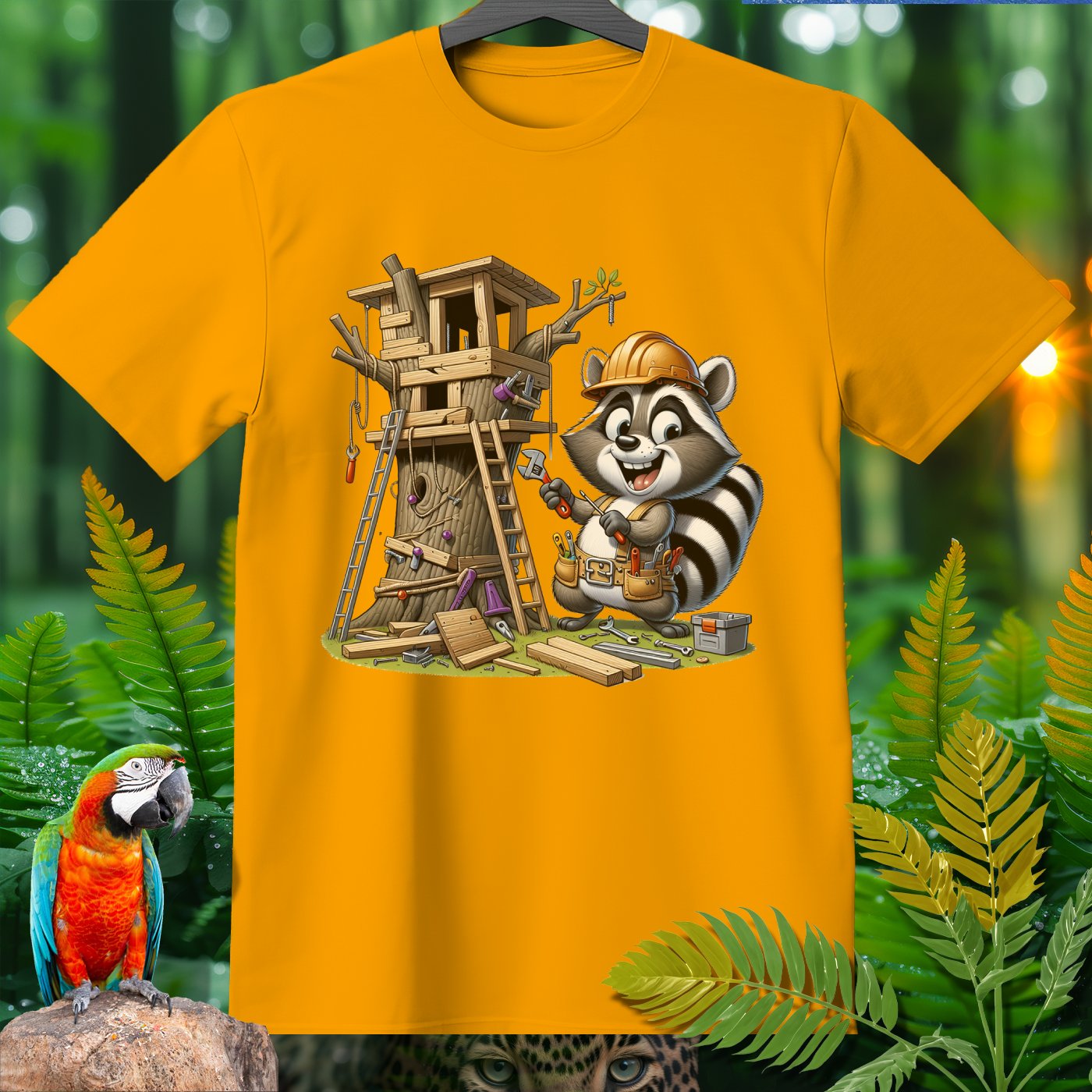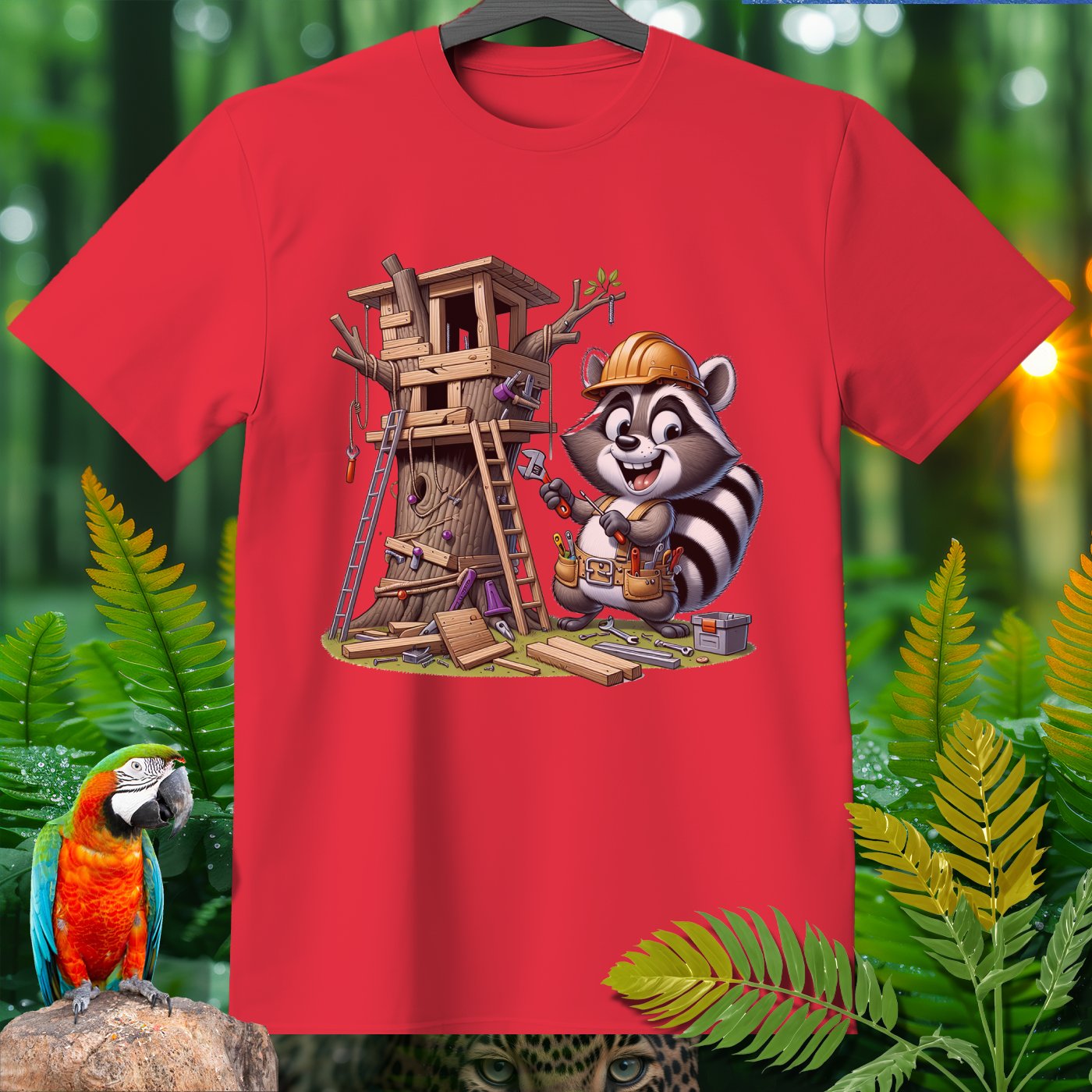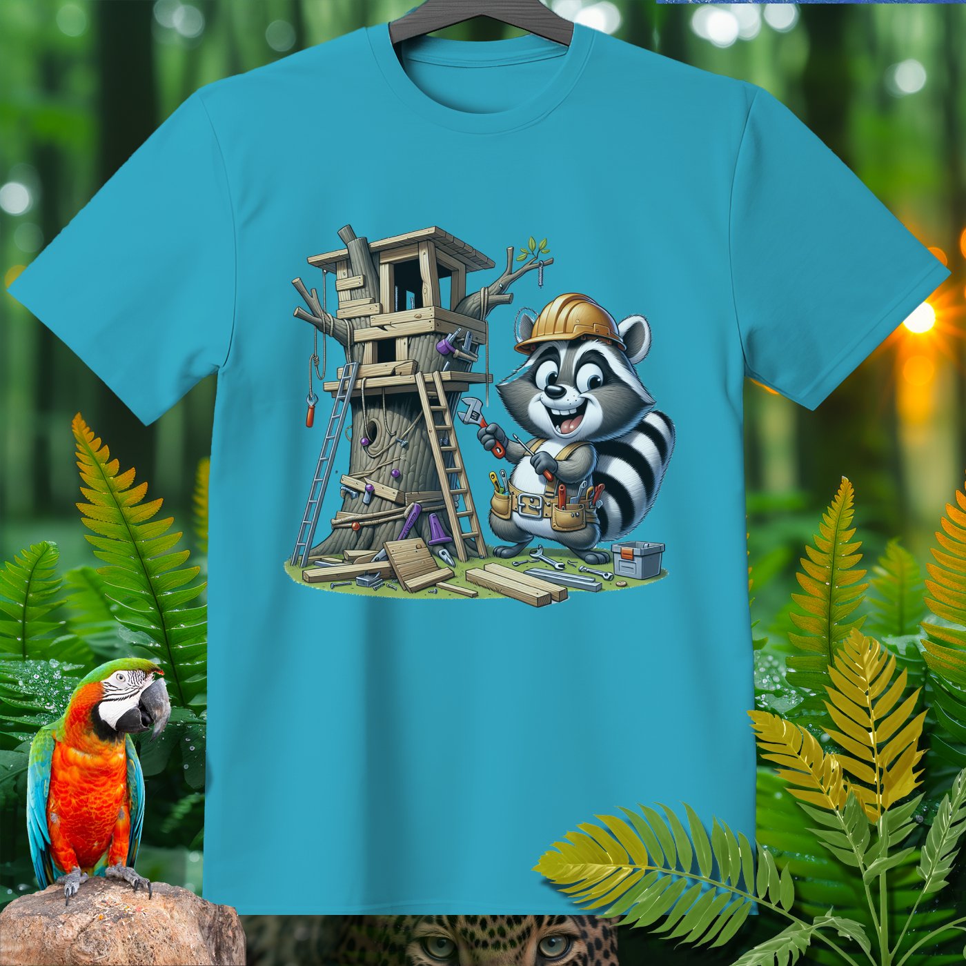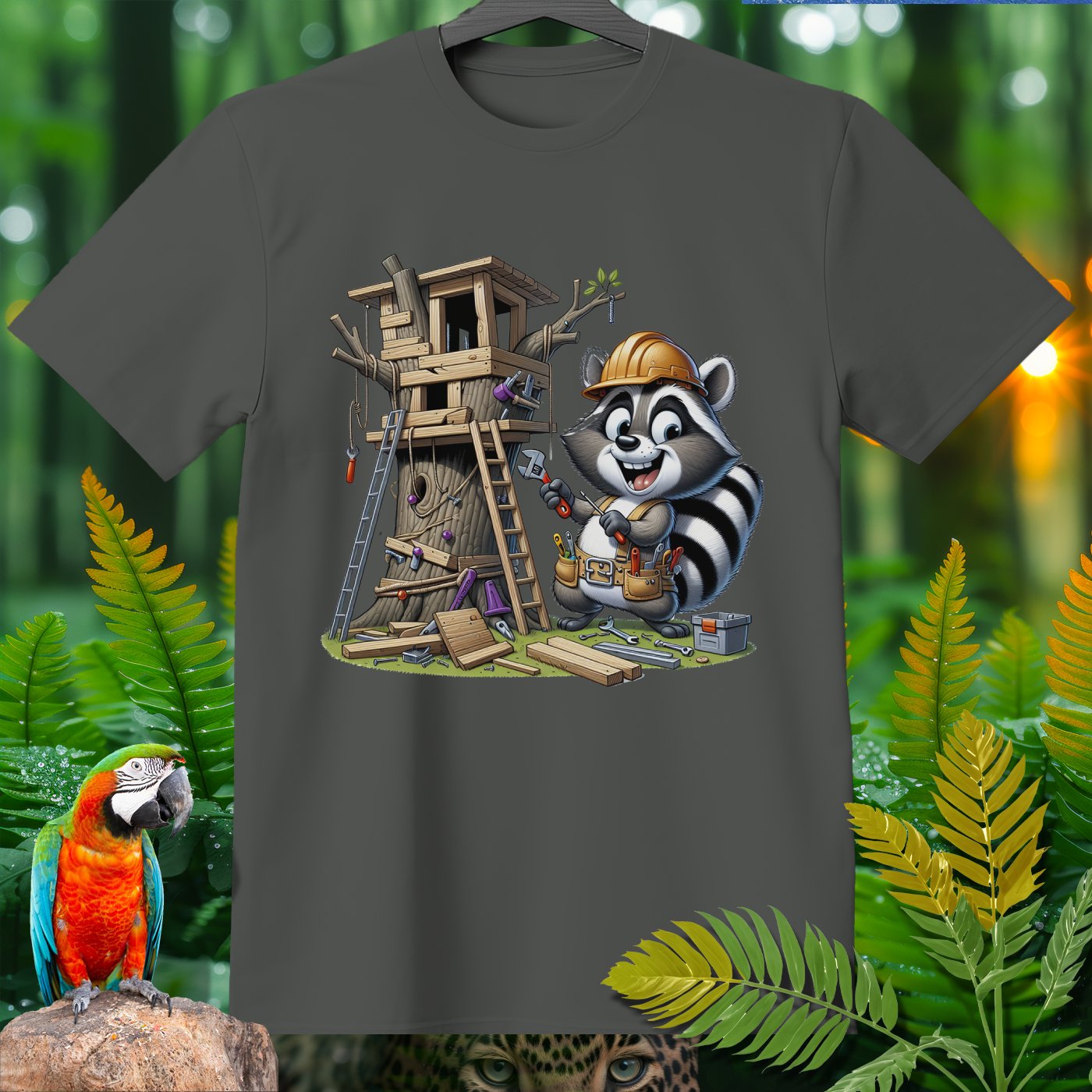 Welcome to the Amazoomania collection, where animals embark on humorous and adventurous sports and activities! This unique design features a cheerful raccoon sporting a tool belt and helmet, busy constructing an elaborate treehouse. The playful and hardworking raccoon brings fun and adventure to your wardrobe, making it a delightful addition for lovers of extraordinary and entertaining designs. Embrace the A-Z of excitement with this one-of-a-kind piece from our collection!