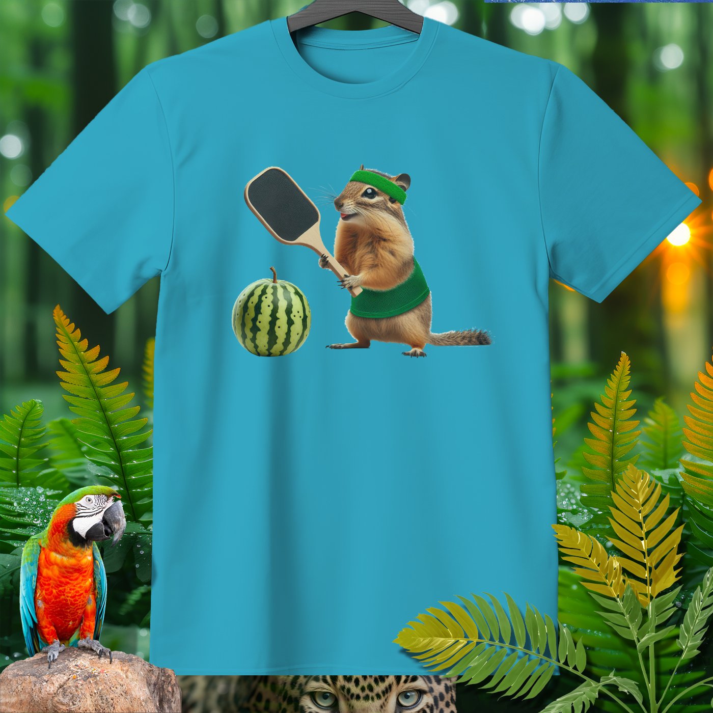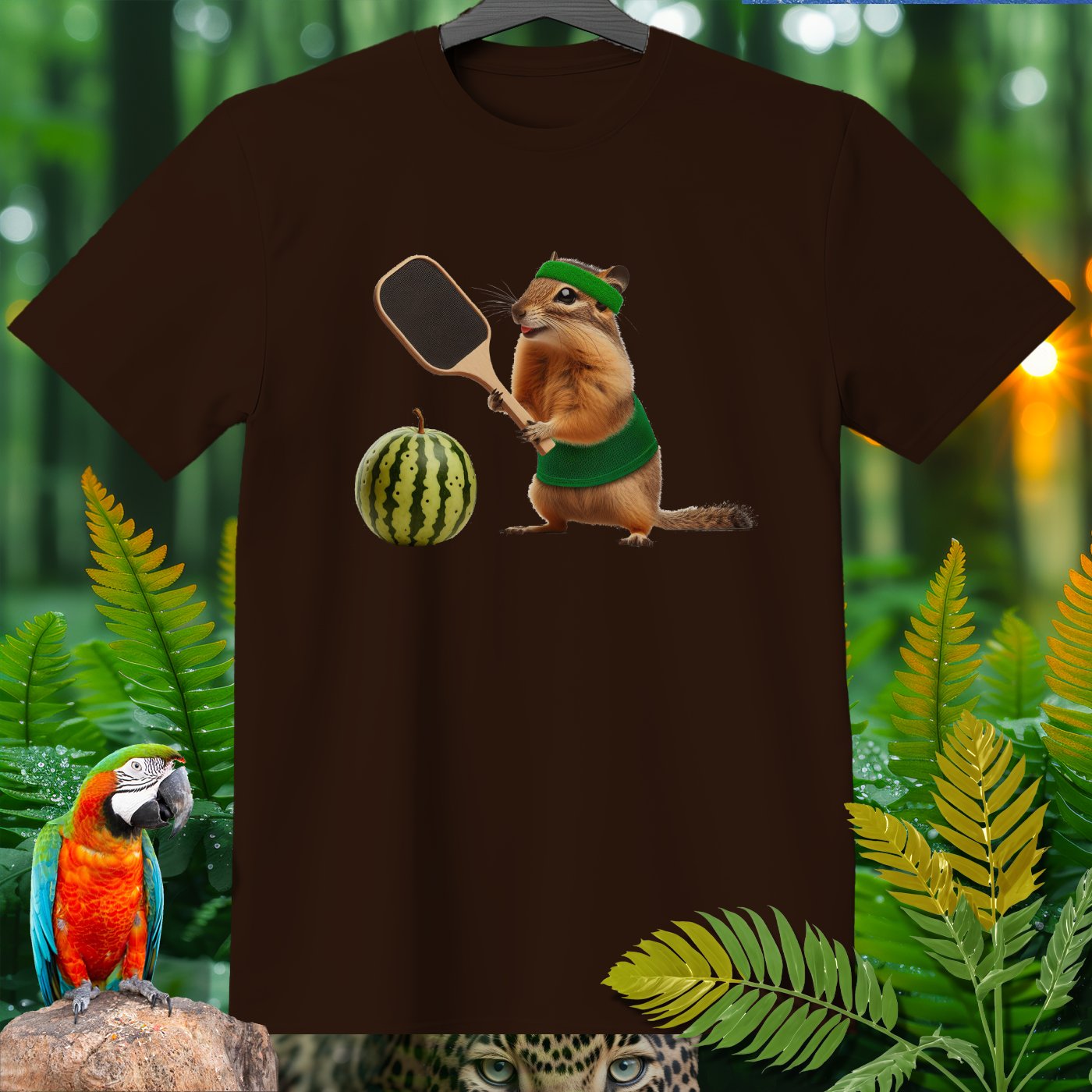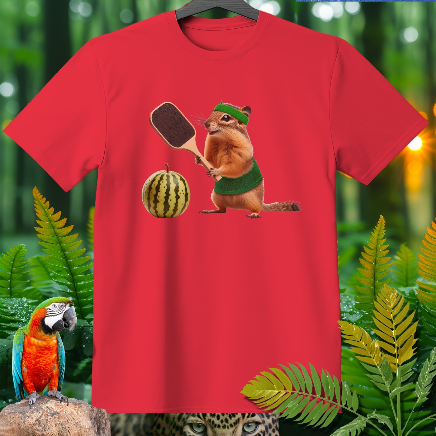 Elevate your wardrobe with our whimsical T-shirt featuring a hilarious chipmunk playing pickleball with a watermelon. Perfect for pickleball enthusiasts and animal lovers alike, this tee adds a fun twist to casual wear. The vibrant print on high-quality fabric ensures comfort and style. Ideal for gifting or adding a unique piece to your collection!