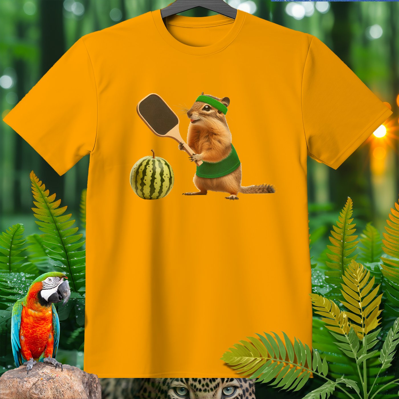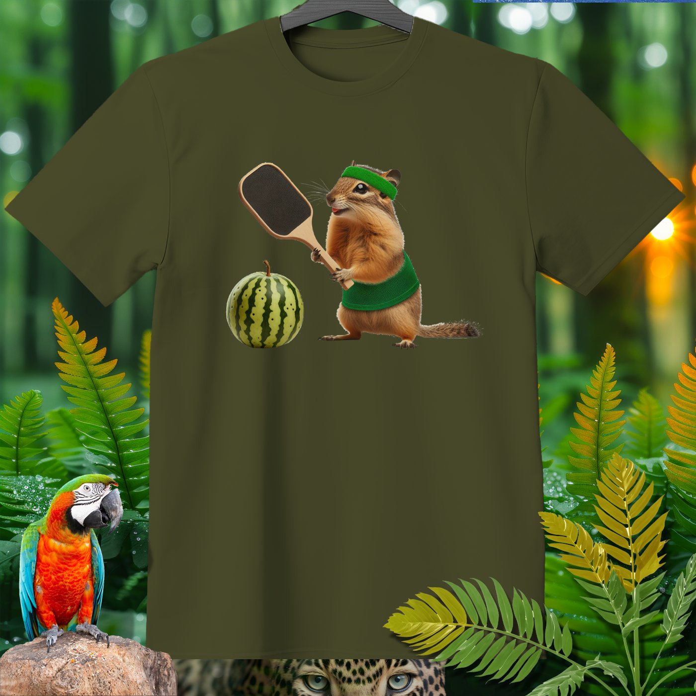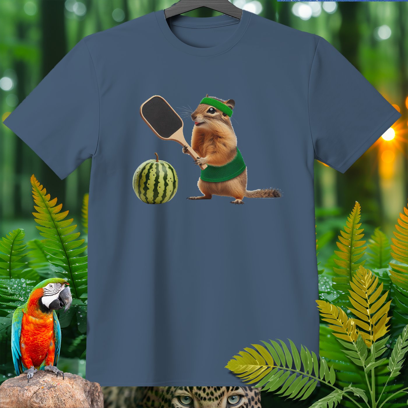 Elevate your wardrobe with our whimsical T-shirt featuring a hilarious chipmunk playing pickleball with a watermelon. Perfect for pickleball enthusiasts and animal lovers alike, this tee adds a fun twist to casual wear. The vibrant print on high-quality fabric ensures comfort and style. Ideal for gifting or adding a unique piece to your collection!