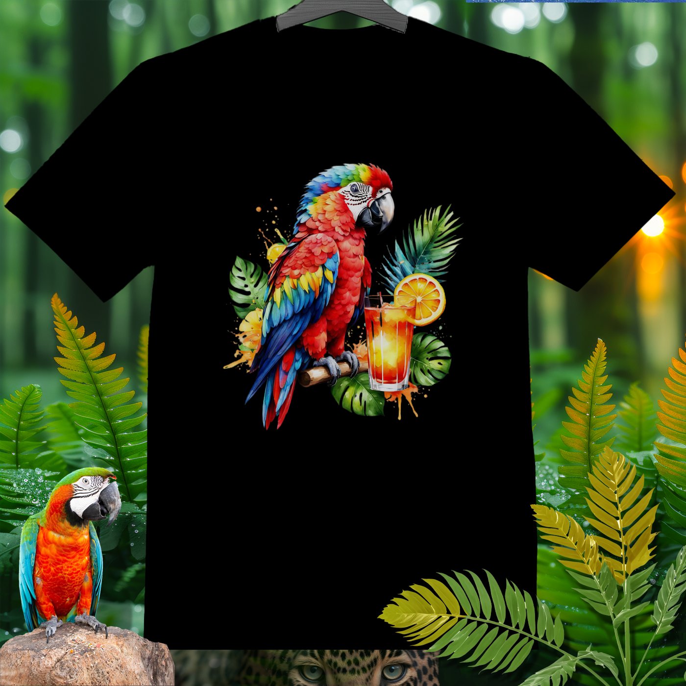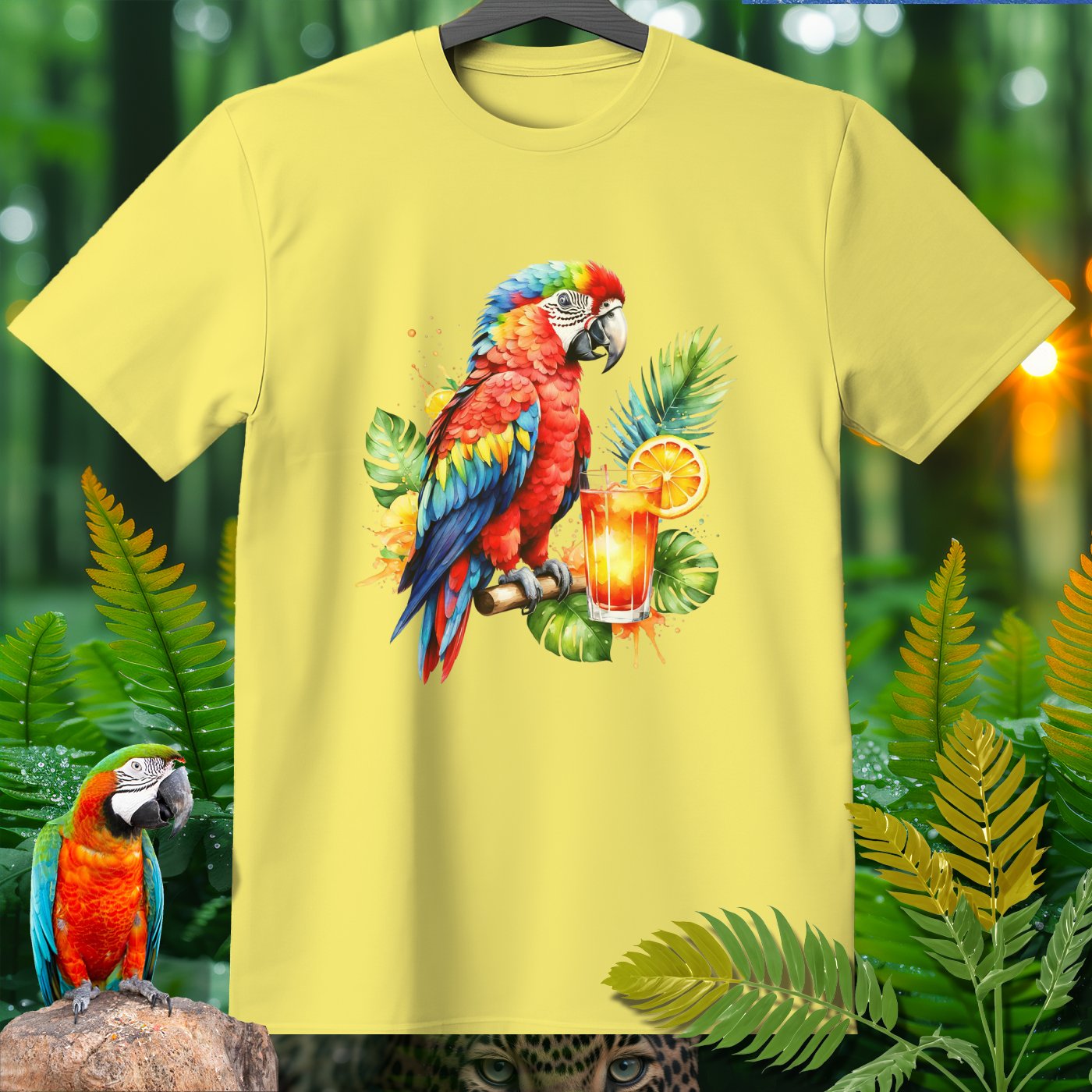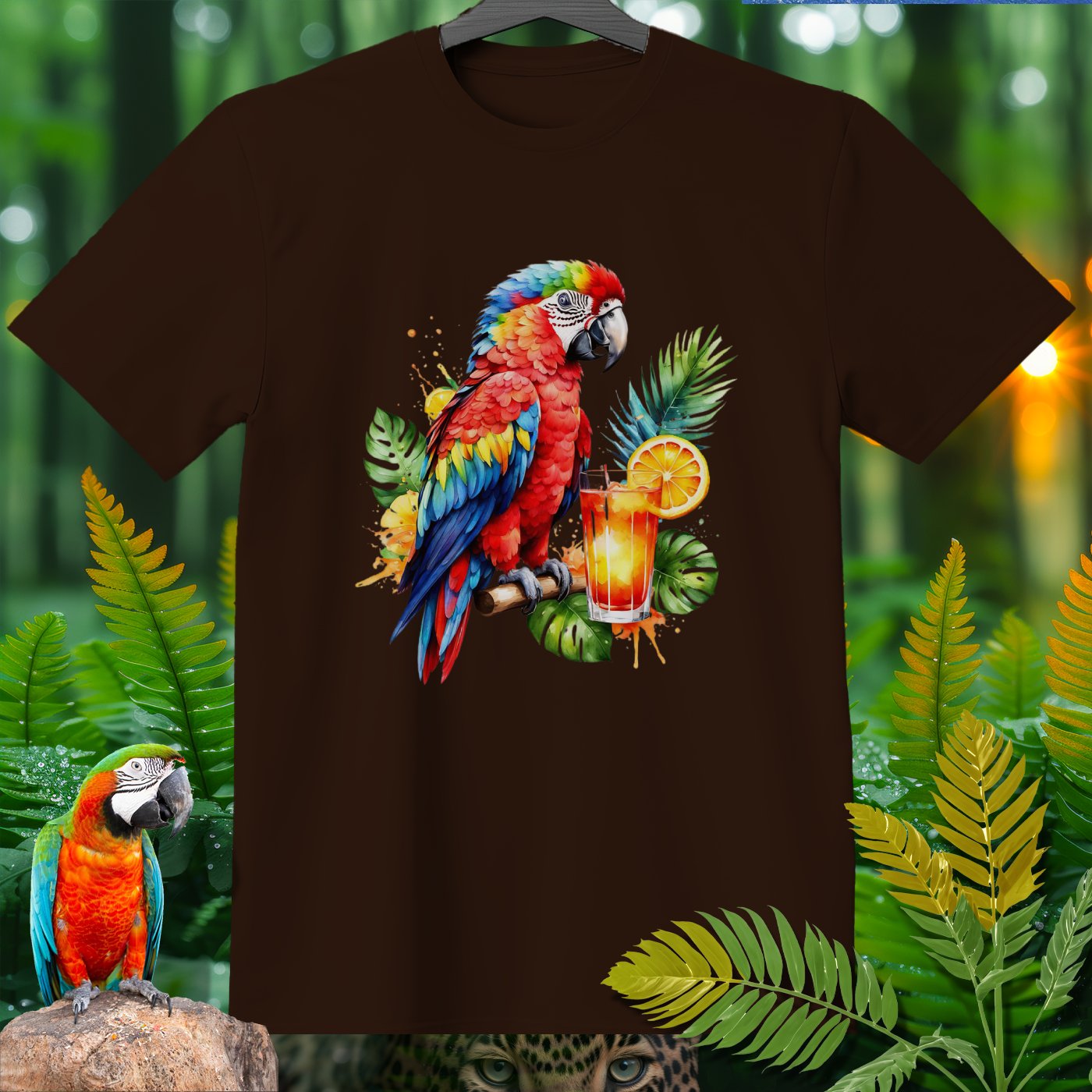 Celebrate the vibrant and lively spirit of nature with our AmazooMania T-Shirt! This eye-catching design features a stunning parrot perched next to a refreshing tropical drink, surrounded by lush green leaves and splashes of color. It's a perfect way to showcase your love for exotic wildlife and tropical adventures. Whether you're lounging at the beach, attending a summer festival, or simply enjoying a relaxed day, this shirt will keep you looking stylish and chilled out. Made from high-quality materials for ultimate comfort, this AmazooMania T-Shirt is a must-have for anyone who loves wild things and the colorful antics of animals when we aren't watching!