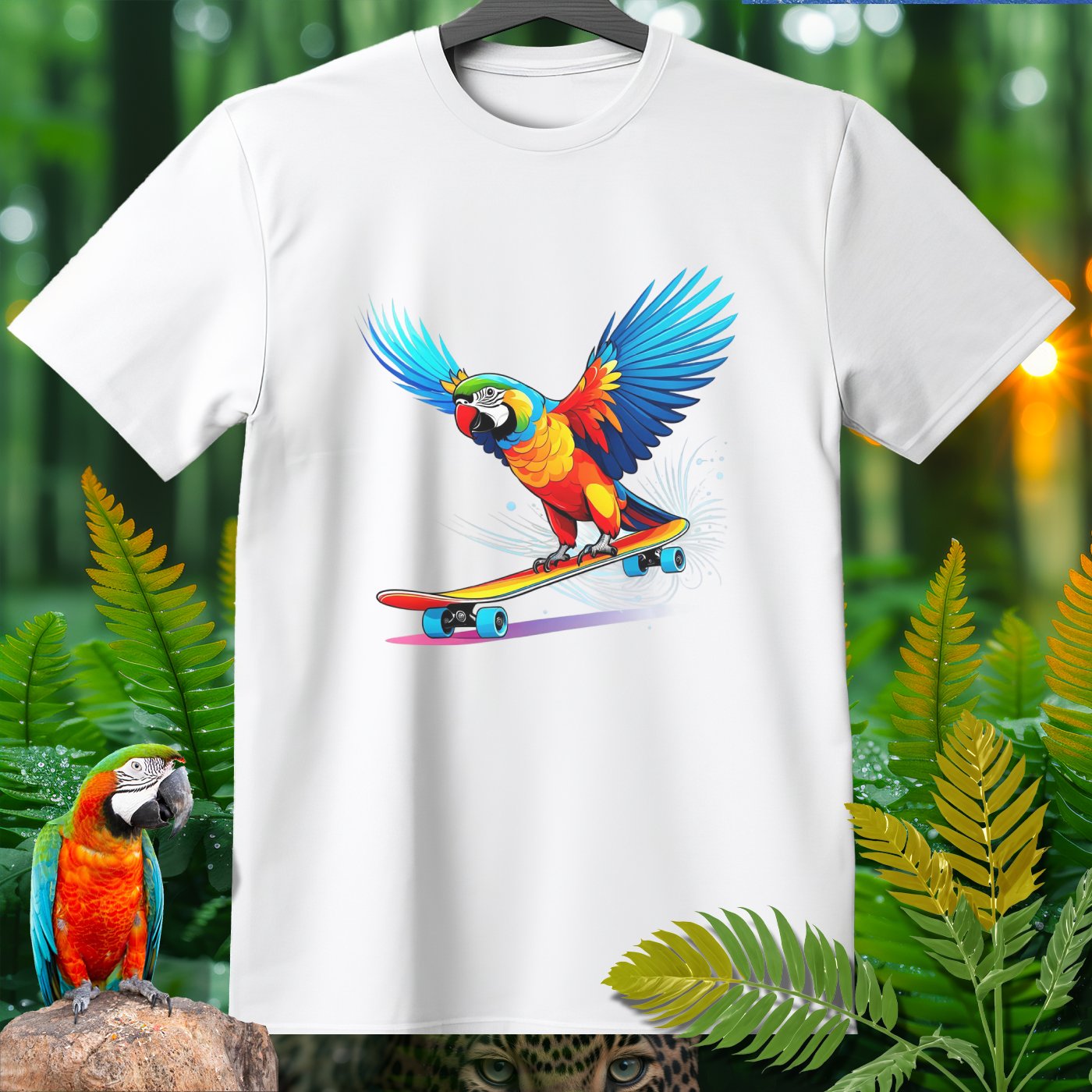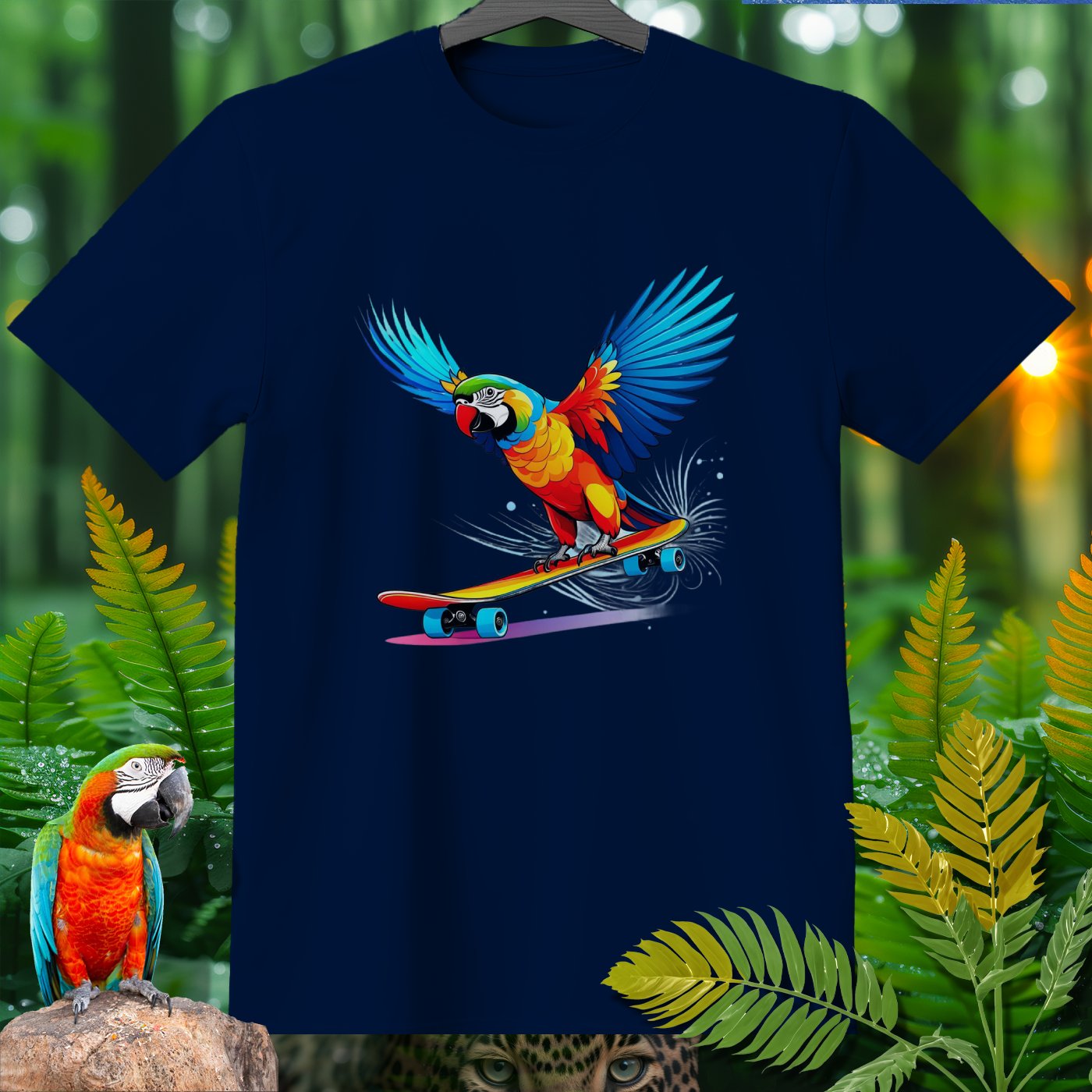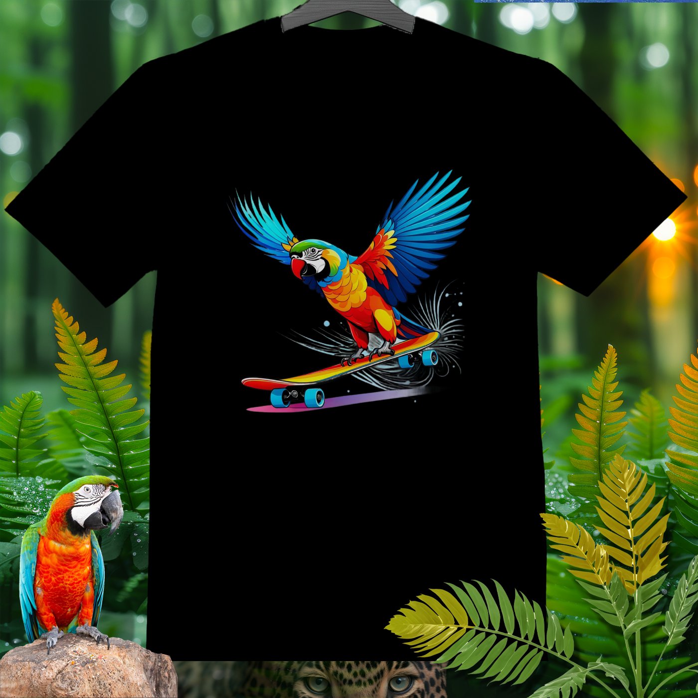 Discover the latest addition to our Amazoomania Collection! Watch as this vibrant parrot skateboards his way into your heart. Unleashing its wild side, this colorful parrot redefines what it means to be sporty and adventurous. Perfect for sport lovers and bird enthusiasts alike, this T-shirt is a playful reminder of how animals do the craziest things when we aren't watching! Feel the thrill and add a splash of color to your wardrobe with this unique design.